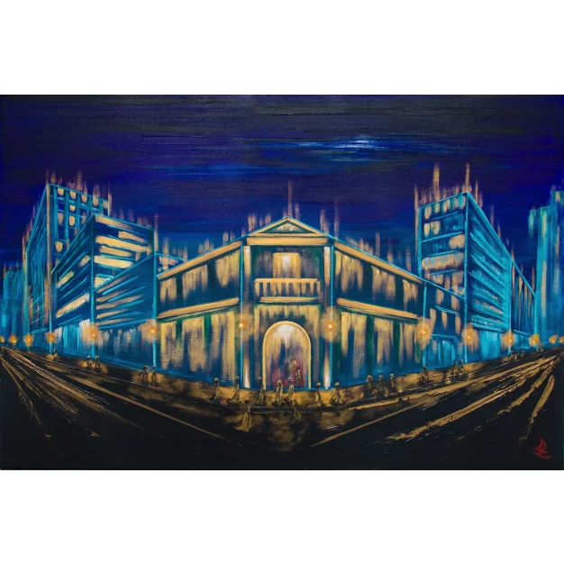 A night at the opera. Stylized figures in long gowns await the theater, while a pale moon watches this scene of elegance in a modern city. Time seems suspended between the magic of the opera and the contemporary metropolis.