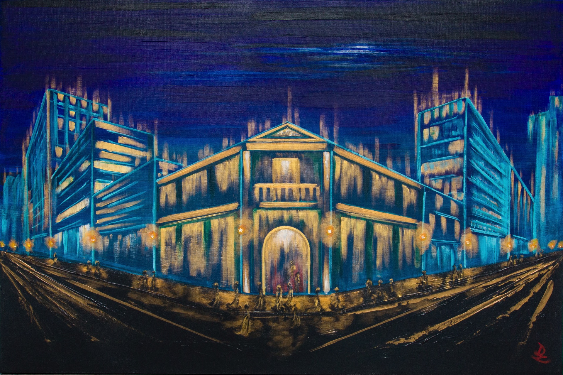 A night at the opera. Stylized figures in long gowns await the theater, while a pale moon watches this scene of elegance in a modern city. Time seems suspended between the magic of the opera and the contemporary metropolis.