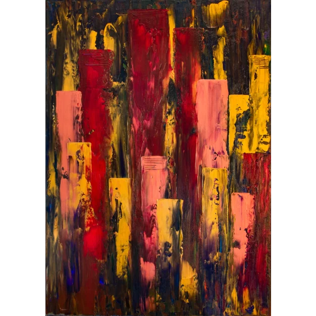 Skyscrapers rise in vertical perspective, their silhouettes dissolving into the background in a fluid blend of colors. The composition evokes an ephemeral, dreamlike cityscape, where the urban environment exists between dream and reality, between form and dissolution.