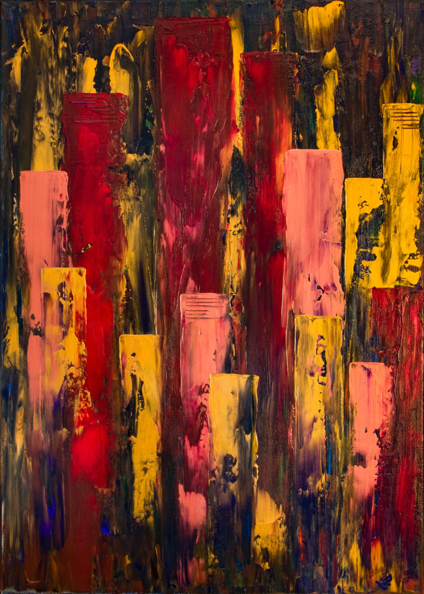 Skyscrapers rise in vertical perspective, their silhouettes dissolving into the background in a fluid blend of colors. The composition evokes an ephemeral, dreamlike cityscape, where the urban environment exists between dream and reality, between form and dissolution.