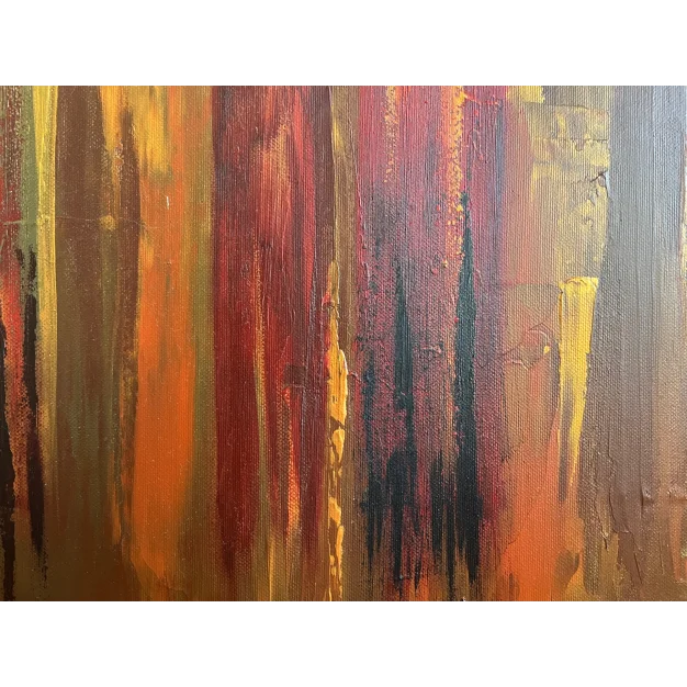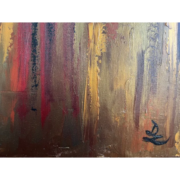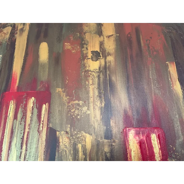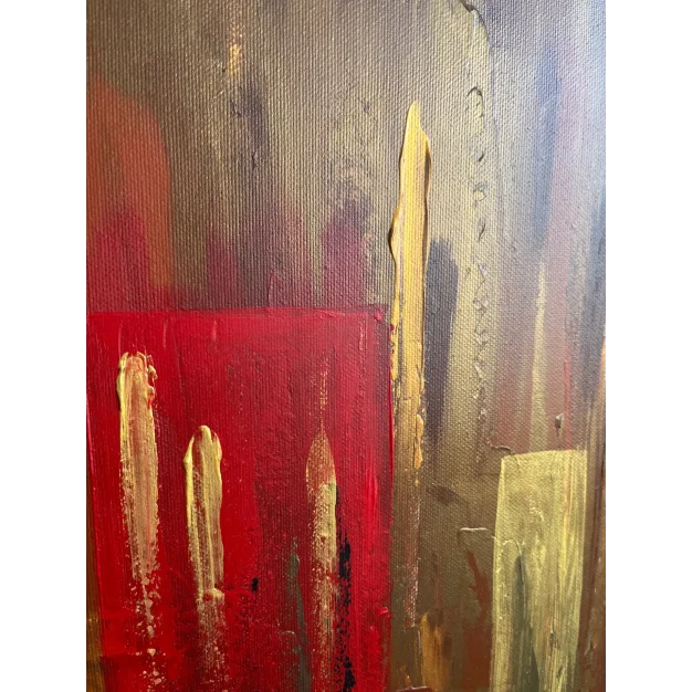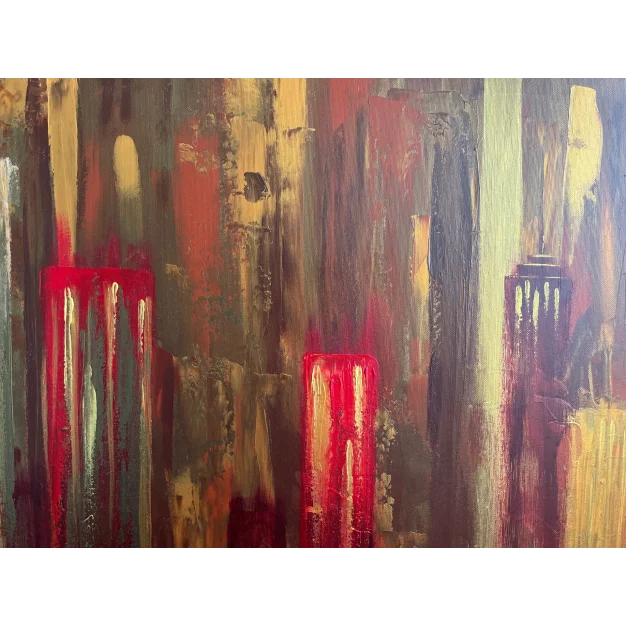 The painting portrays an abstract city, a skyline glowing in gold, bronze, and red. A surreal atmosphere surrounds the scene, as the metallic tones catch and reflect the light, drawing the viewer in. The reflections pulse with life, leading the eye into the vibrant chaos of a dreamlike city, where movement, energy, and illusion blend into a hypnotic rhythm.