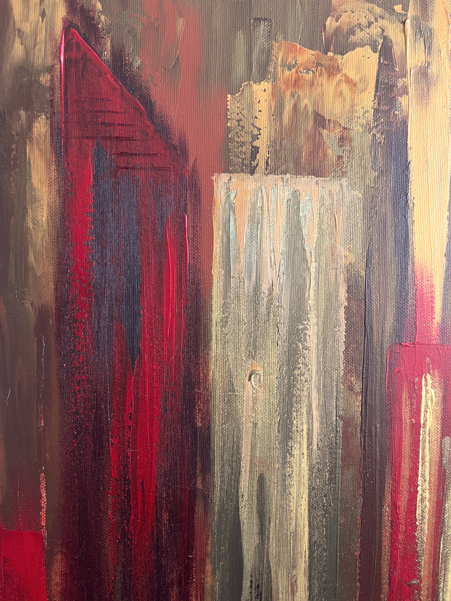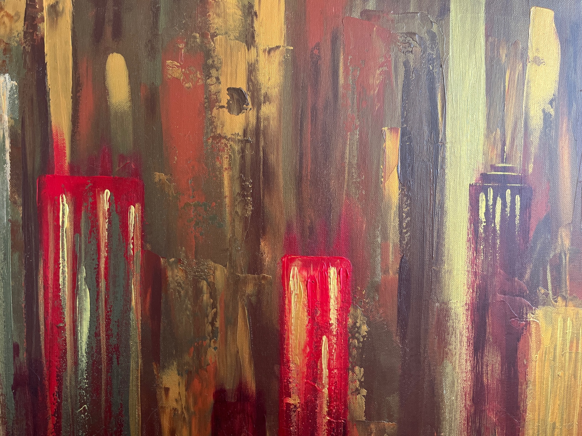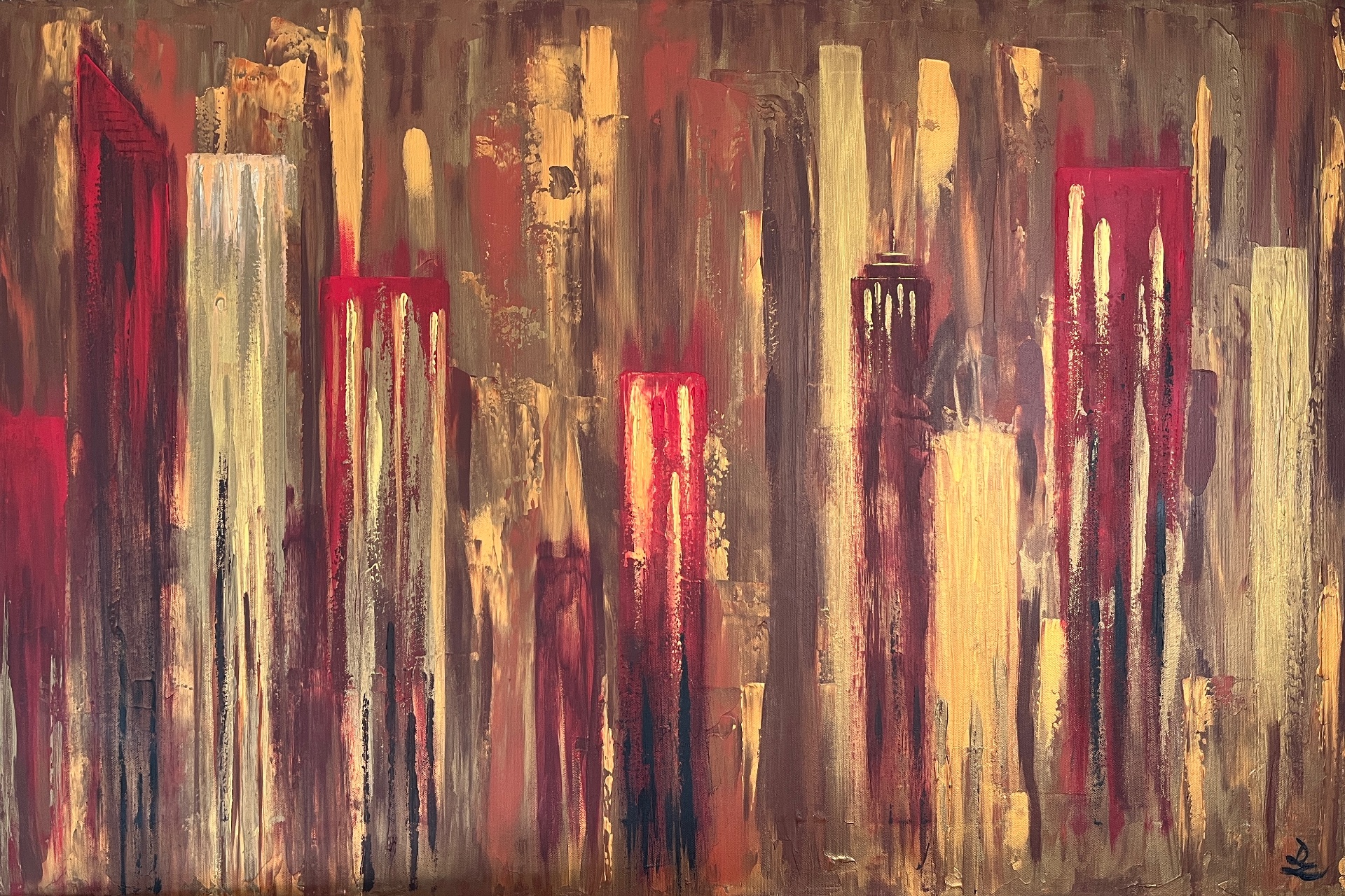 The painting portrays an abstract city, a skyline glowing in gold, bronze, and red. A surreal atmosphere surrounds the scene, as the metallic tones catch and reflect the light, drawing the viewer in. The reflections pulse with life, leading the eye into the vibrant chaos of a dreamlike city, where movement, energy, and illusion blend into a hypnotic rhythm.