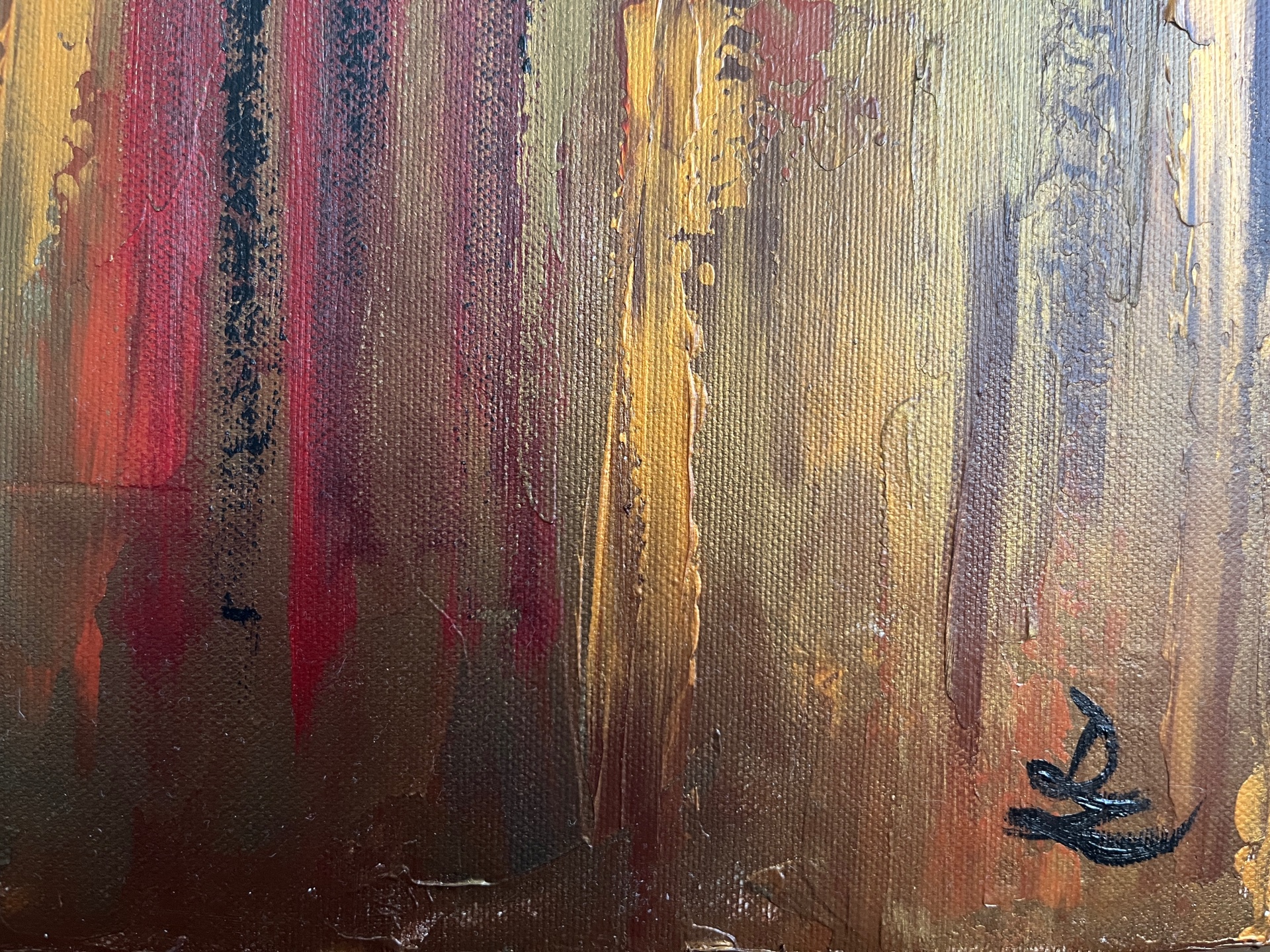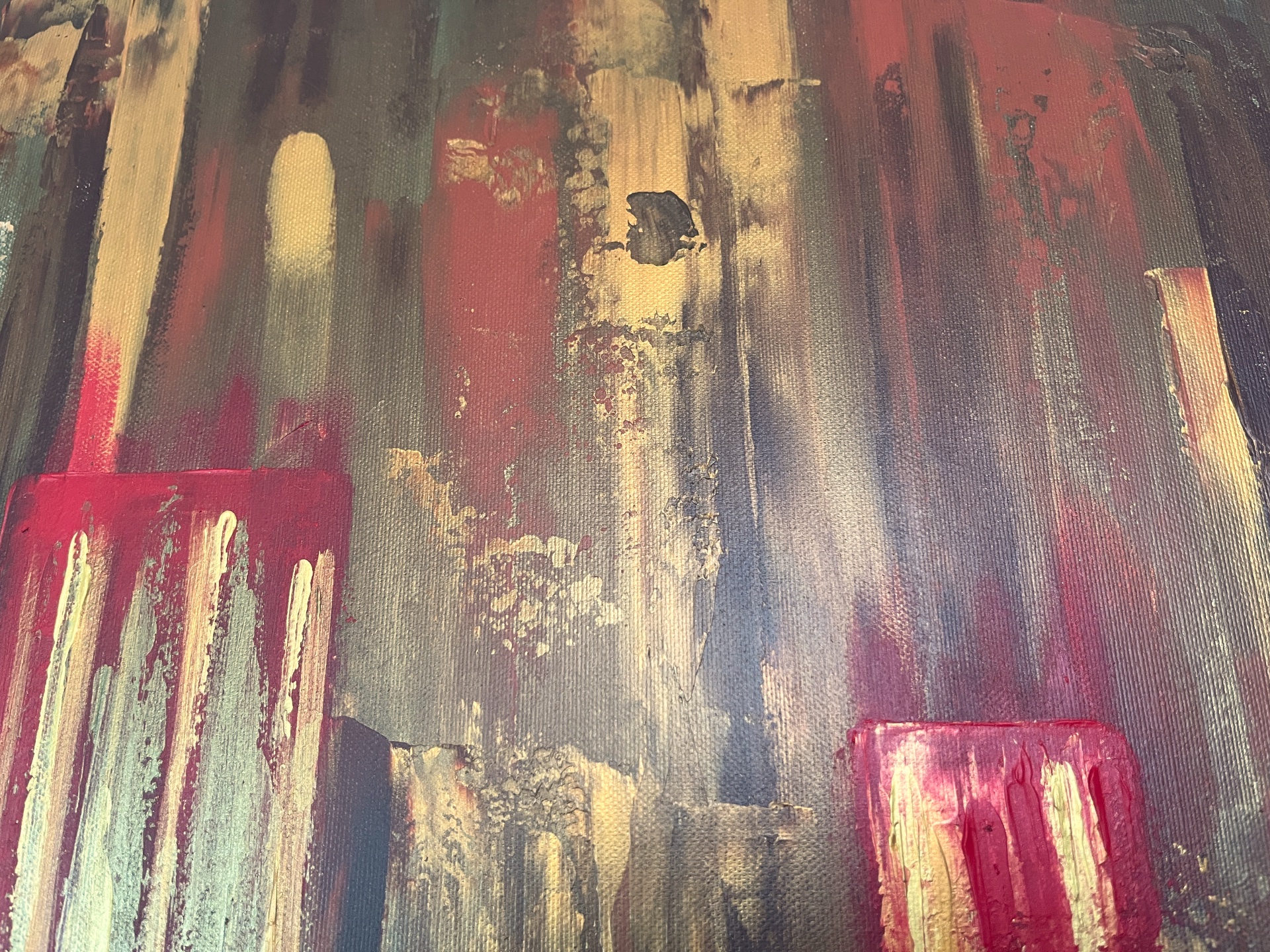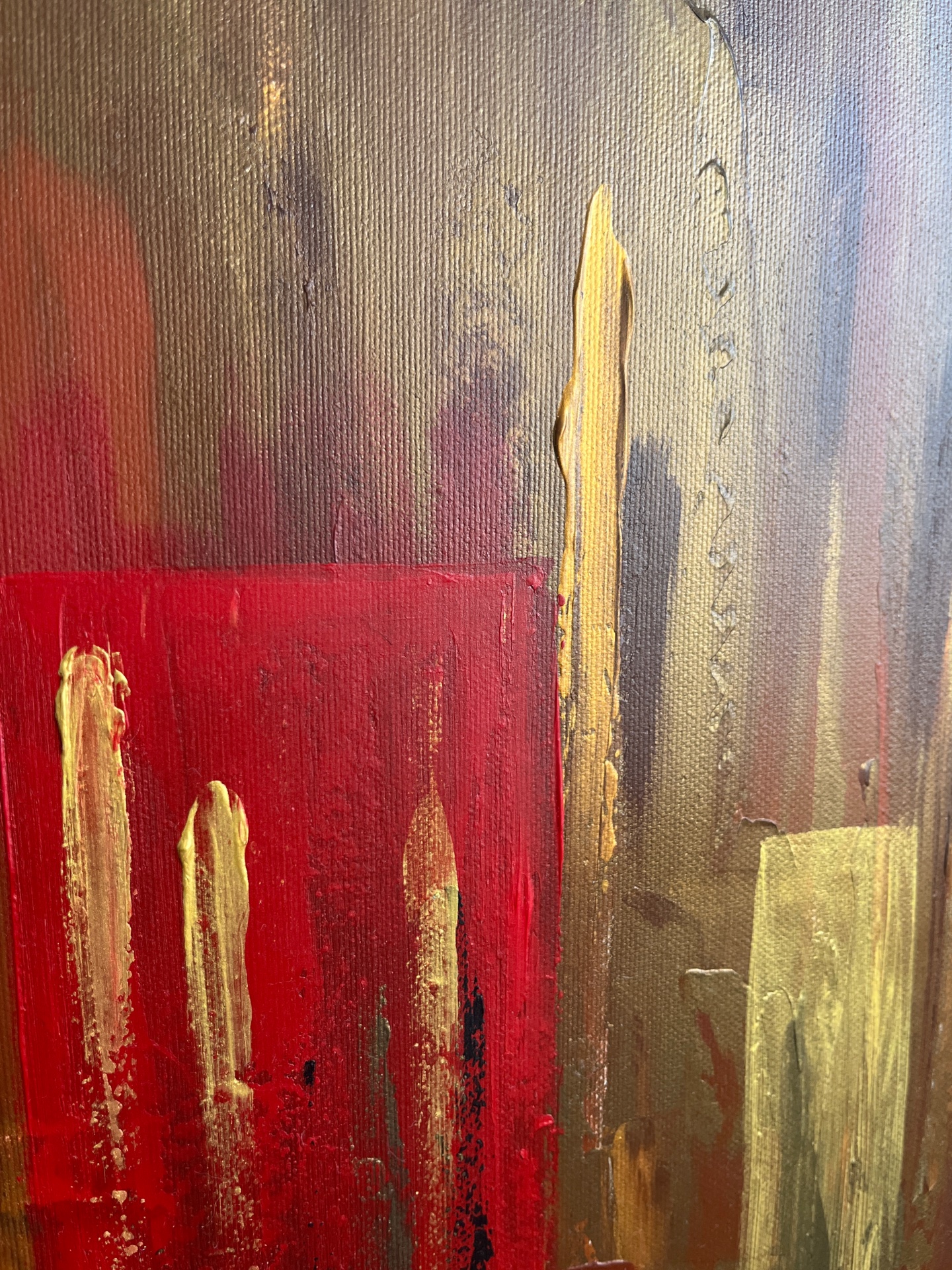 The painting portrays an abstract city, a skyline glowing in gold, bronze, and red. A surreal atmosphere surrounds the scene, as the metallic tones catch and reflect the light, drawing the viewer in. The reflections pulse with life, leading the eye into the vibrant chaos of a dreamlike city, where movement, energy, and illusion blend into a hypnotic rhythm.