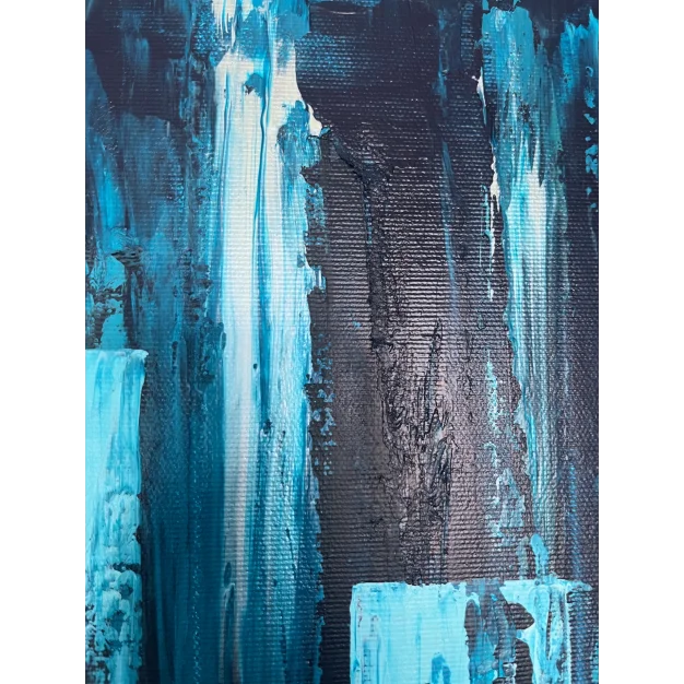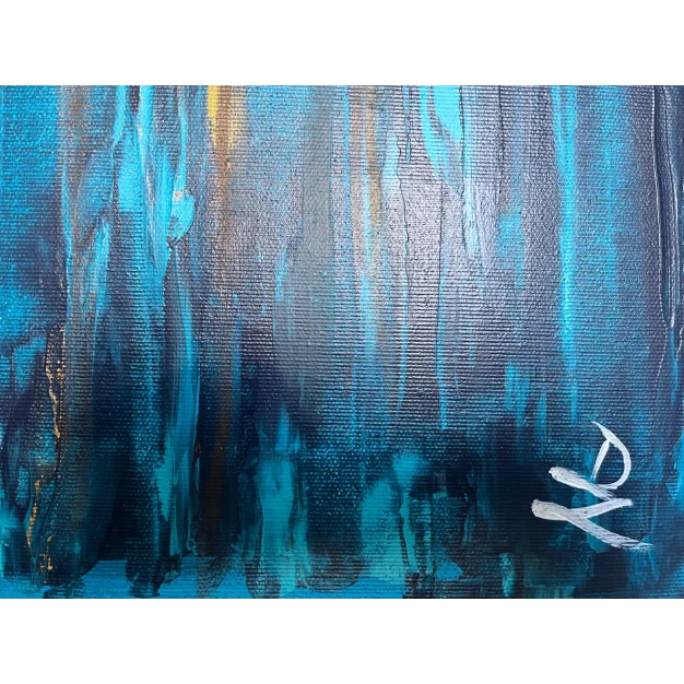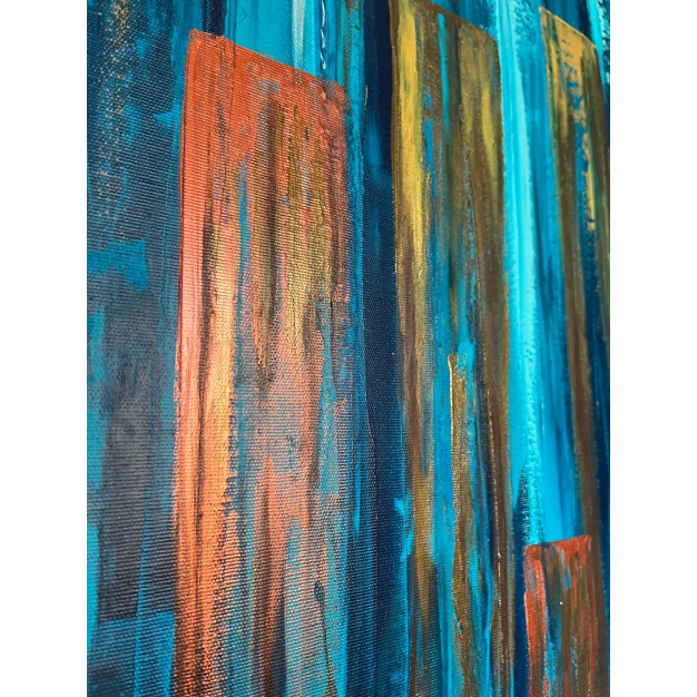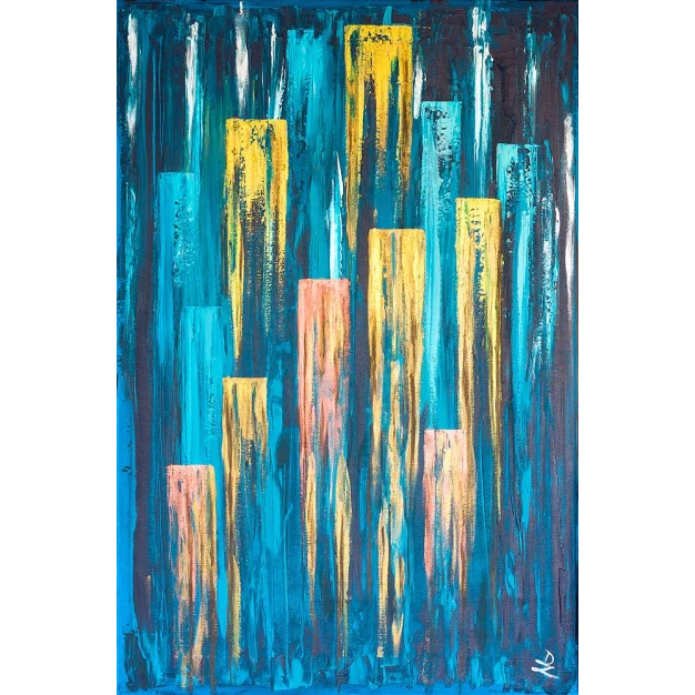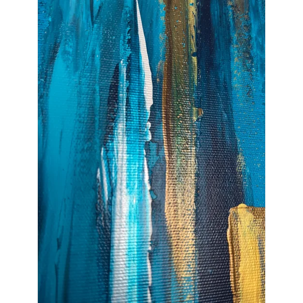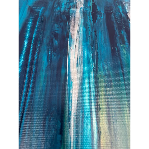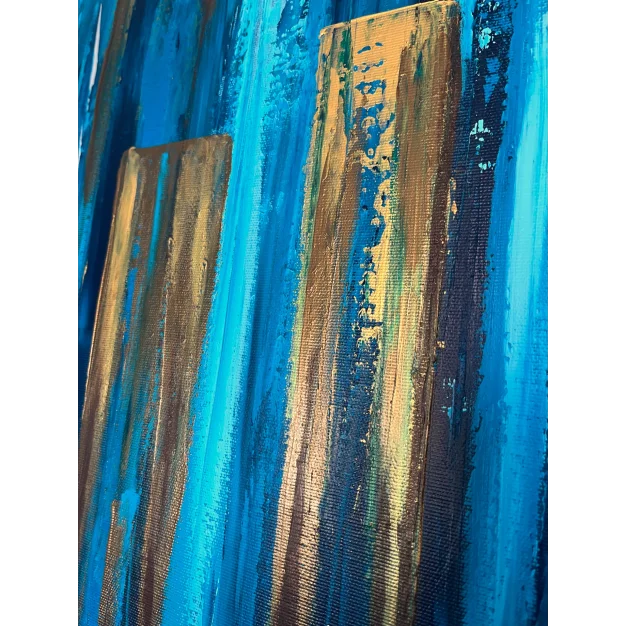The painting depicts an abstract city where golden and copper skyscrapers rise from a vast expanse of turquoise tones that blend seamlessly into one another. The hues meet and dissolve without boundaries, as if the very matter were in transformation. It is a distant, rarefied vision where the perception of time seems to slow down, and the city becomes a luminous, shifting reflection of something that does not entirely belong to reality.