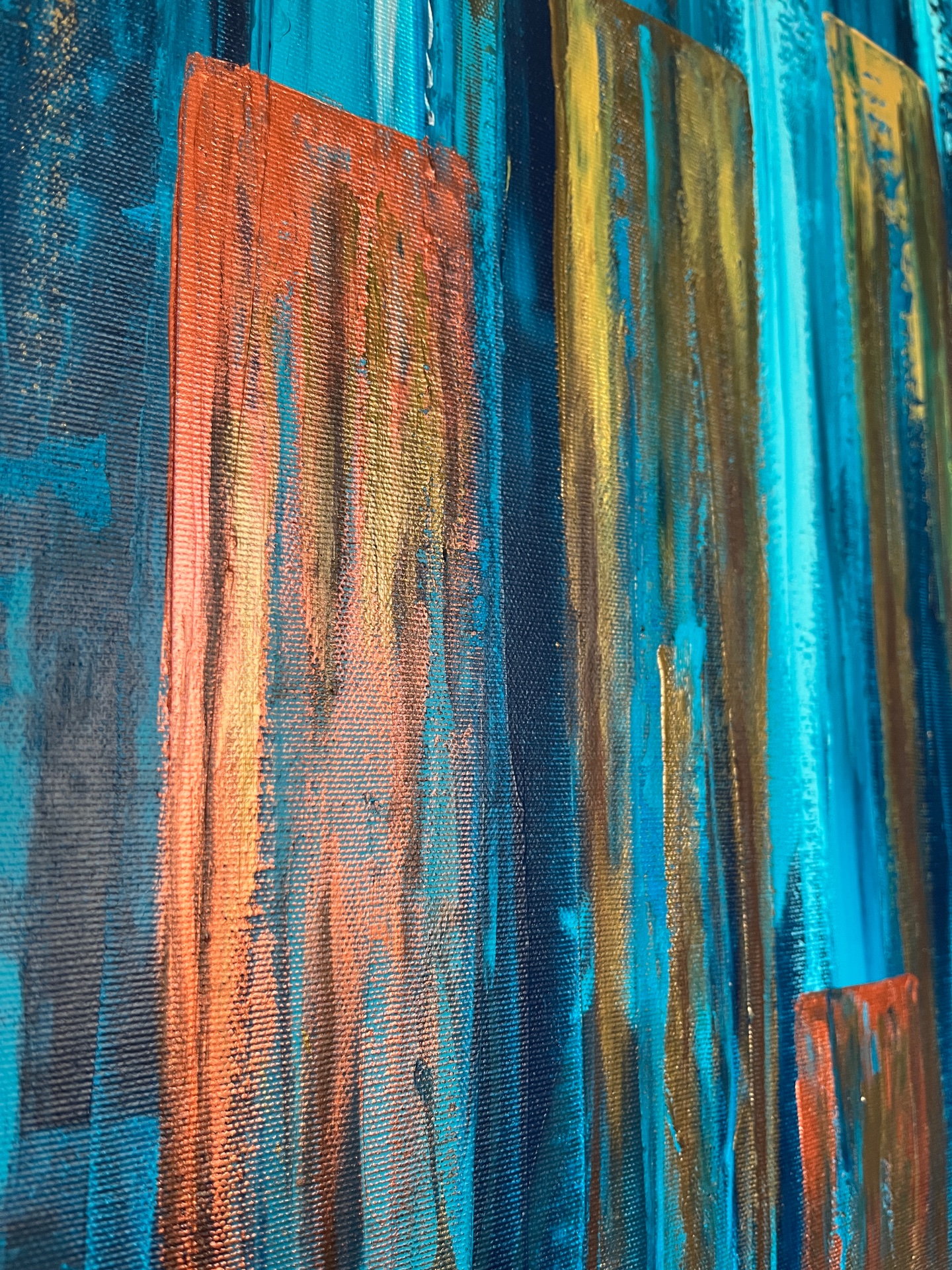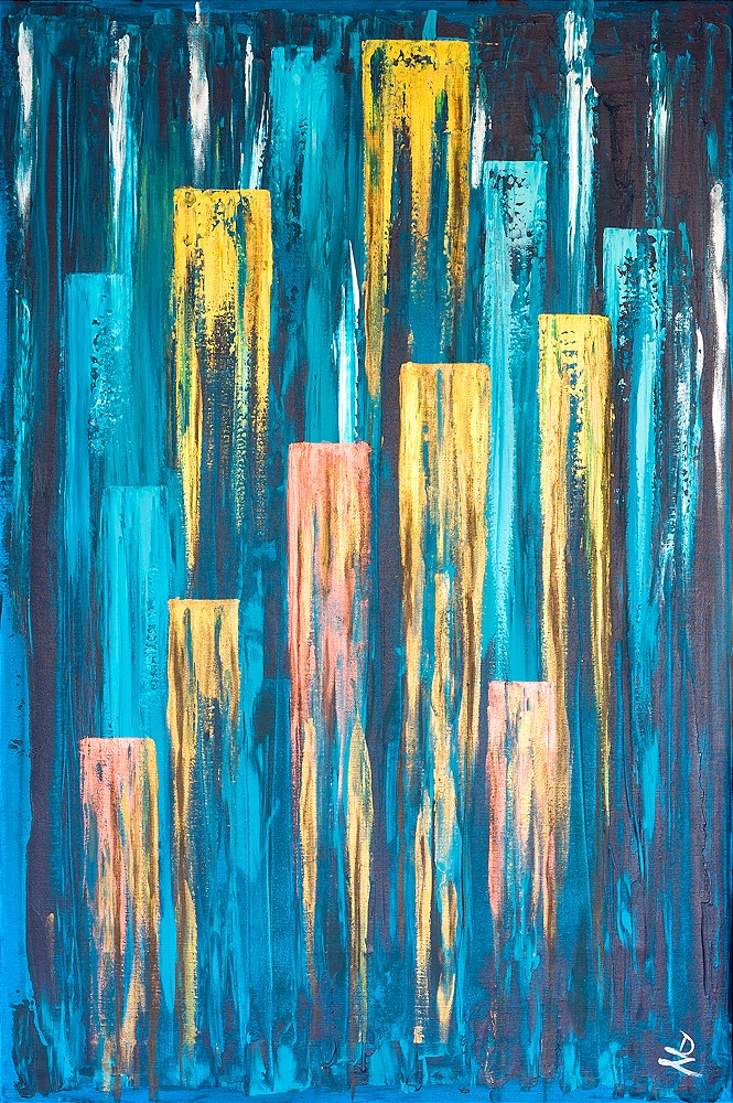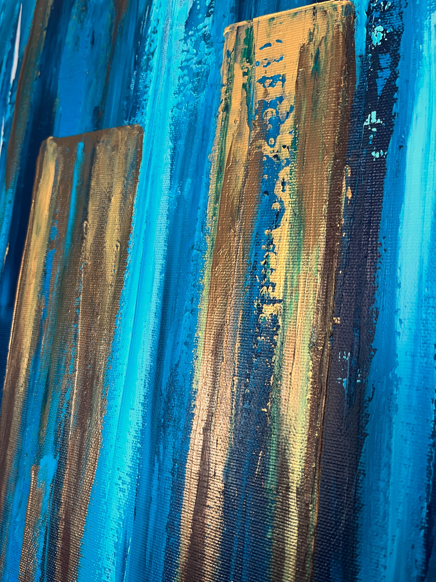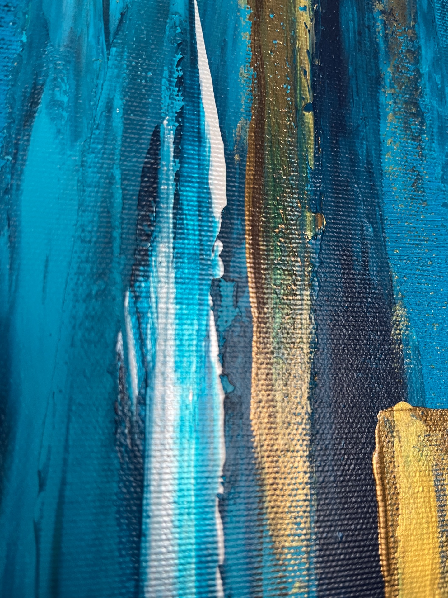 The painting depicts an abstract city where golden and copper skyscrapers rise from a vast expanse of turquoise tones that blend seamlessly into one another. The hues meet and dissolve without boundaries, as if the very matter were in transformation. It is a distant, rarefied vision where the perception of time seems to slow down, and the city becomes a luminous, shifting reflection of something that does not entirely belong to reality.