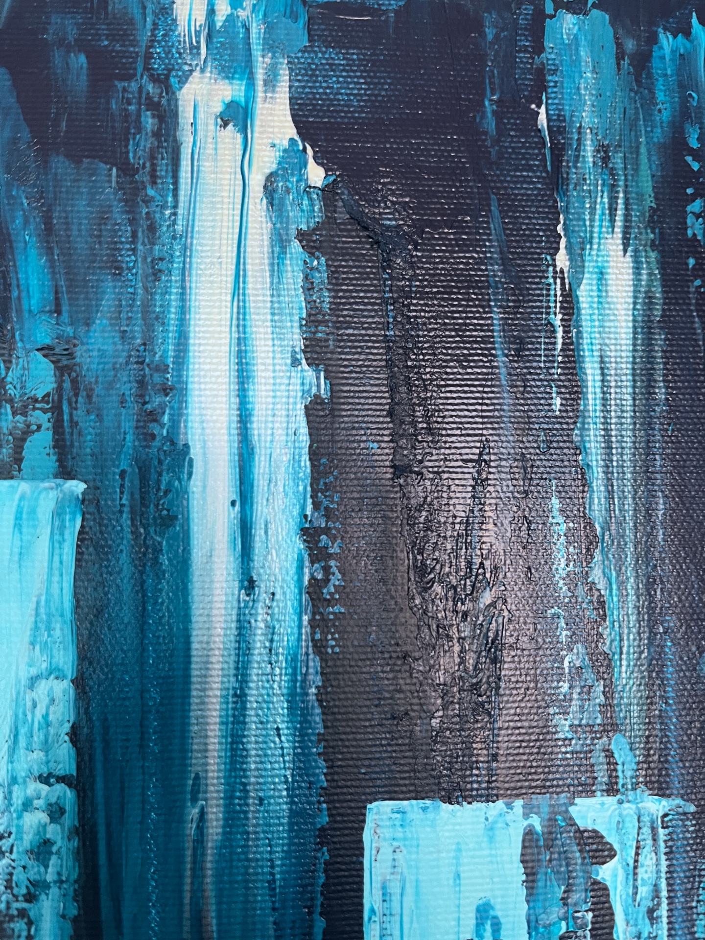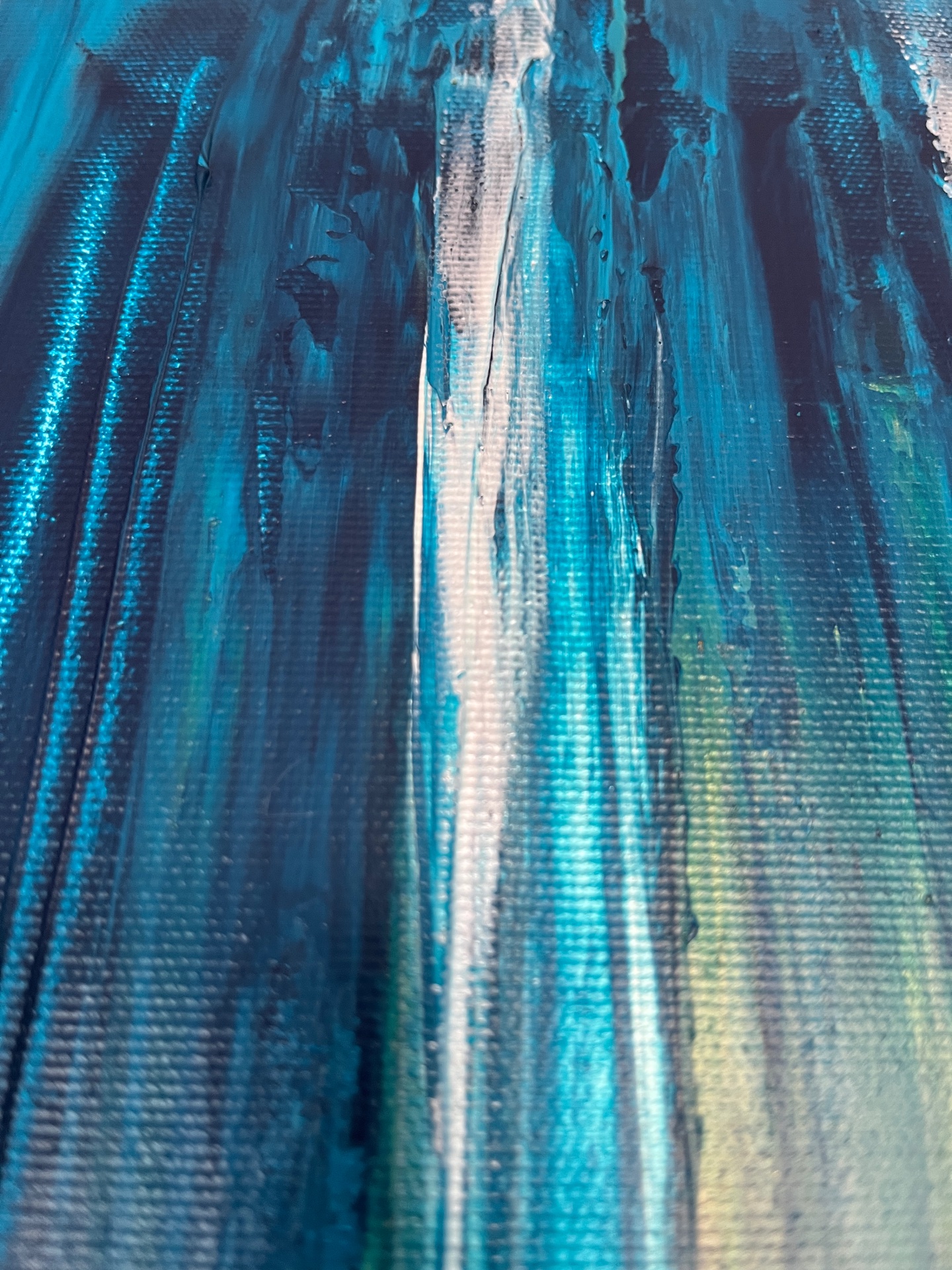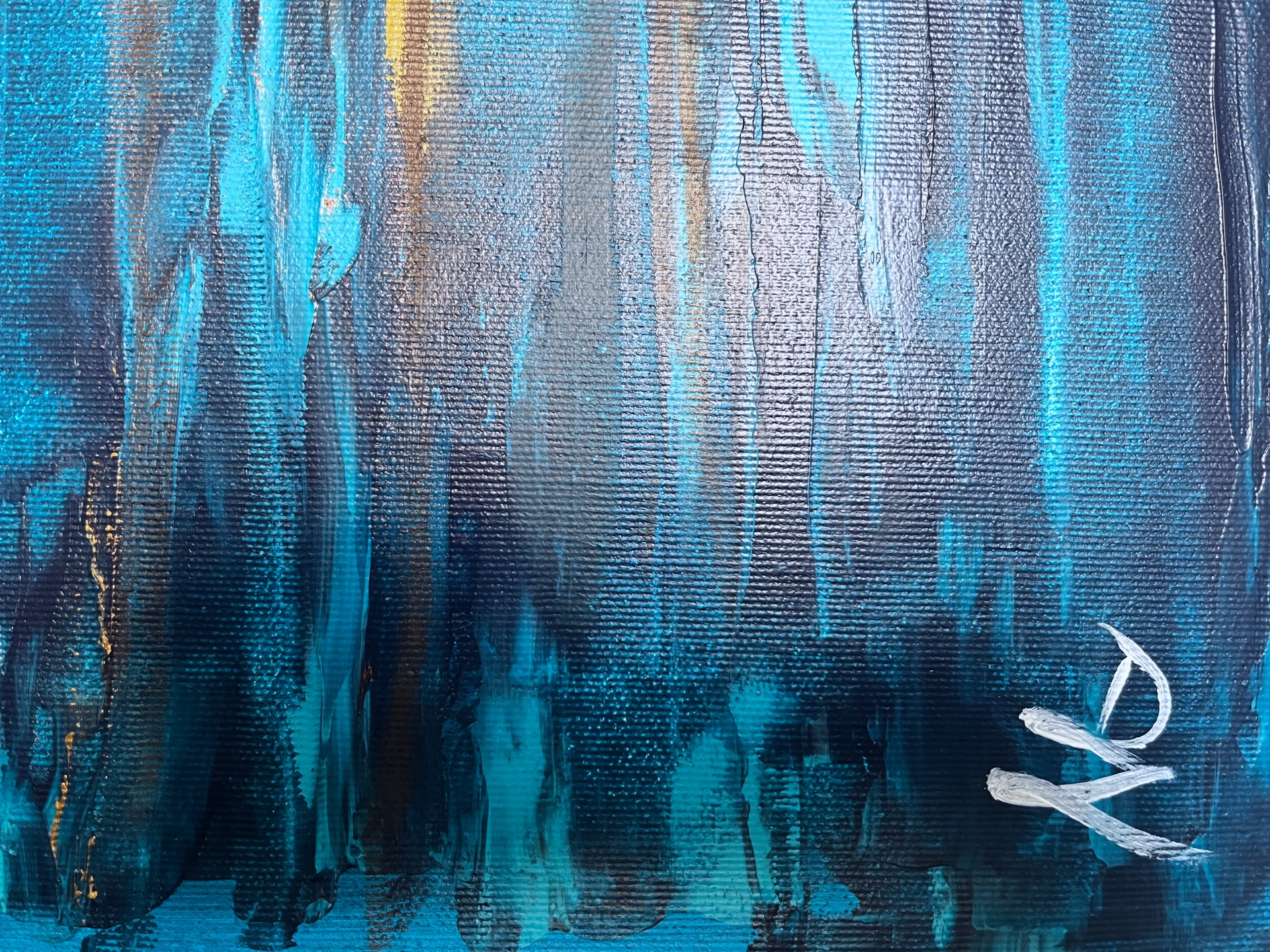 The painting depicts an abstract city where golden and copper skyscrapers rise from a vast expanse of turquoise tones that blend seamlessly into one another. The hues meet and dissolve without boundaries, as if the very matter were in transformation. It is a distant, rarefied vision where the perception of time seems to slow down, and the city becomes a luminous, shifting reflection of something that does not entirely belong to reality.