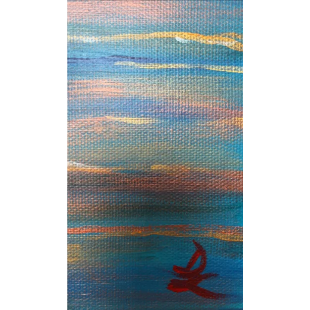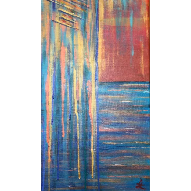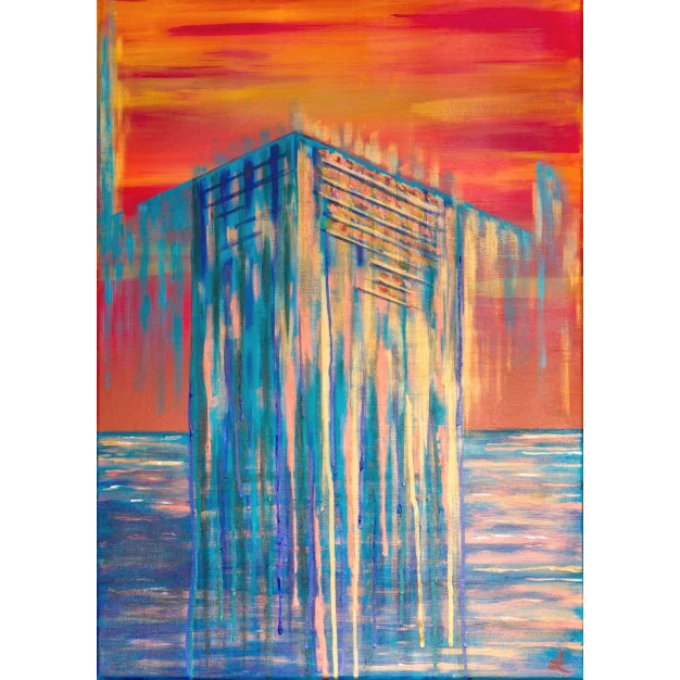 In the scene, a profound transformation is taking place. The matter loses its substance and drips into a sea that is both its reflection and its extension. The change is strong, radical. The transition unfolds before our eyes, in a slow yet inevitable movement. In the distance, the sunset sets the sky ablaze with intense colors, as if it wants to participate with force in this metamorphosis, changing itself minute by minute in a chase of lights that will eventually dissolve into darkness. Is this an event affecting the world around us, or does it represent something that happens deep within ourselves? Is it a negative or positive process? What is certain is that everything is destined for evolution, reborn in new forms.