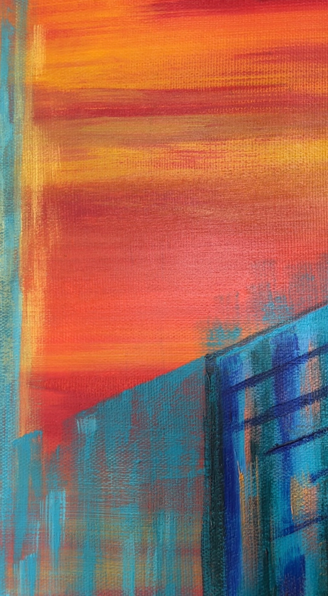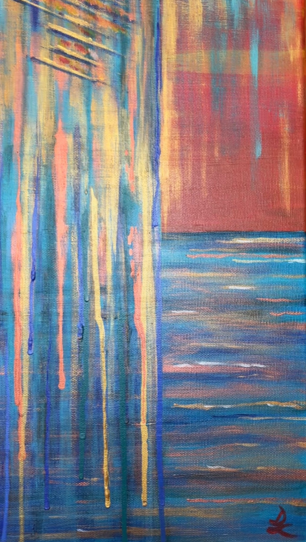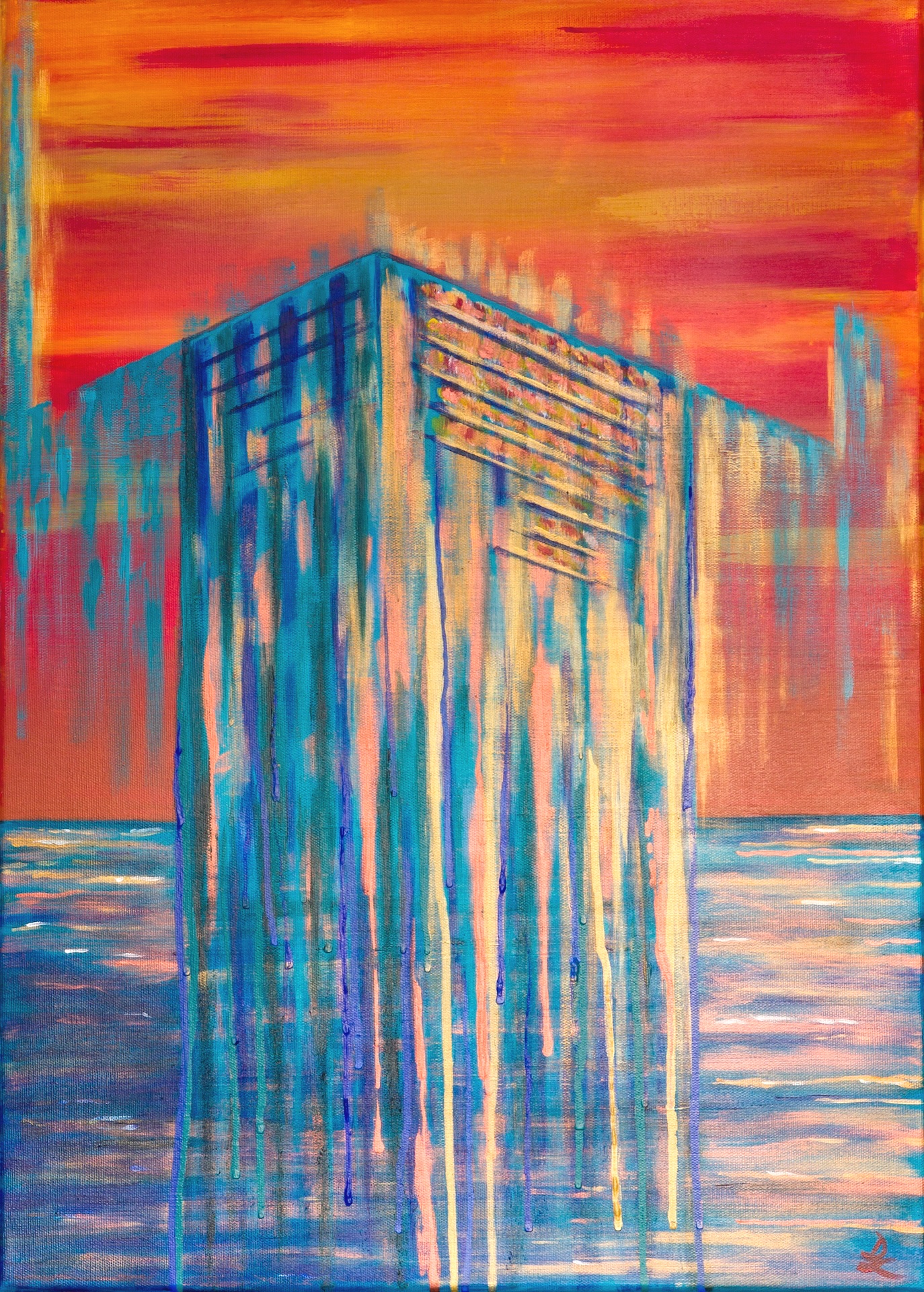 In the scene, a profound transformation is taking place. The matter loses its substance and drips into a sea that is both its reflection and its extension. The change is strong, radical. The transition unfolds before our eyes, in a slow yet inevitable movement. In the distance, the sunset sets the sky ablaze with intense colors, as if it wants to participate with force in this metamorphosis, changing itself minute by minute in a chase of lights that will eventually dissolve into darkness. Is this an event affecting the world around us, or does it represent something that happens deep within ourselves? Is it a negative or positive process? What is certain is that everything is destined for evolution, reborn in new forms.