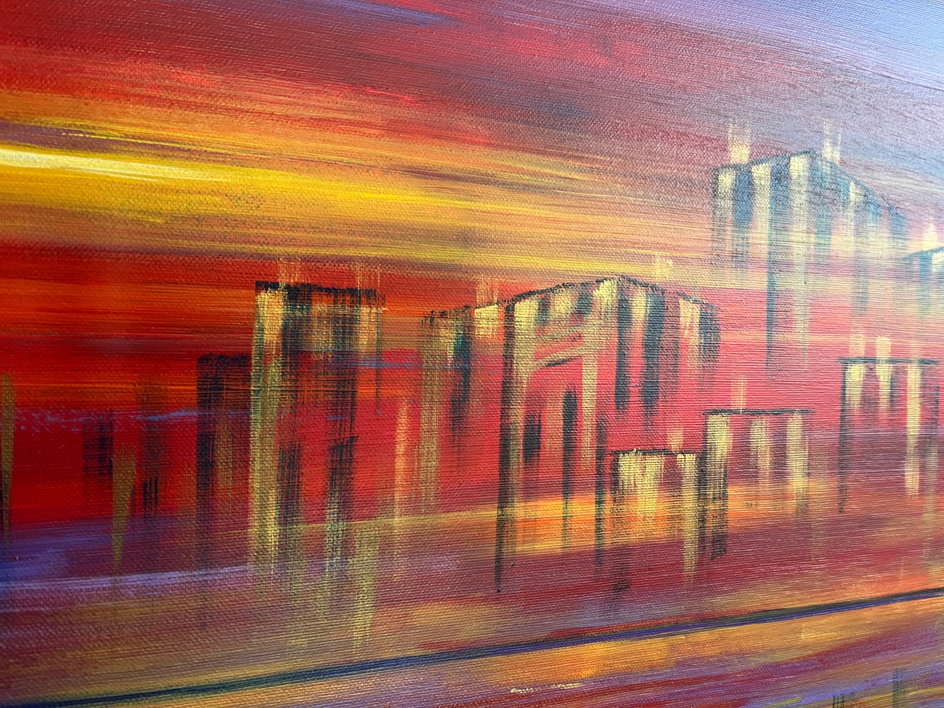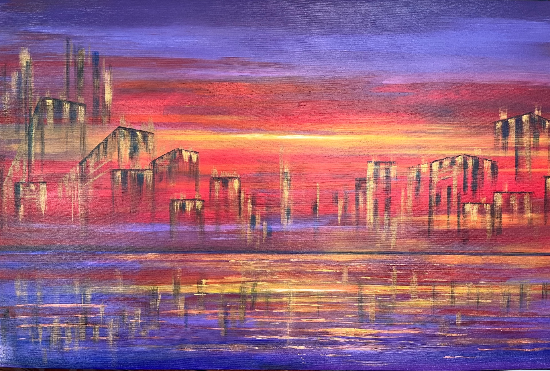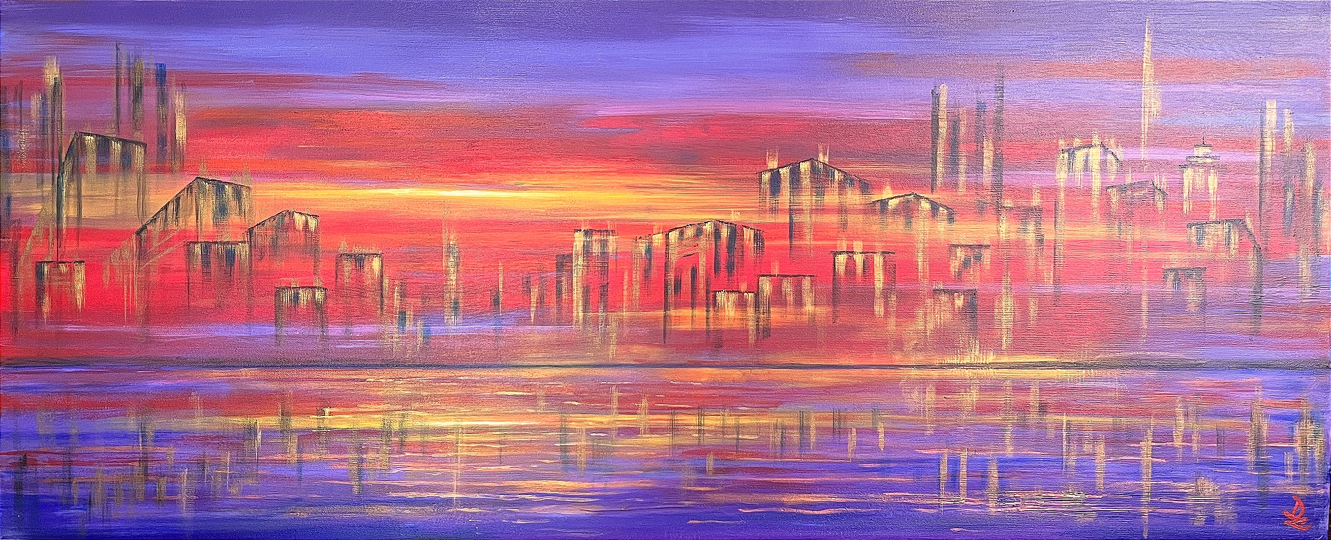 Evanescence captures the moment when the city seems to dissolve between sky and water. It is not just a sunset skyline: it is a suspended place where the remaining golden light transforms every building into a fragment of memory, every reflection into an ephemeral recollection. The artwork invites contemplation of the fragility of things, the delicate boundary between reality and dream, presence and disappearance.