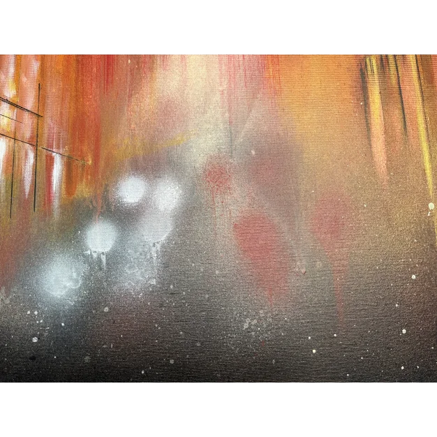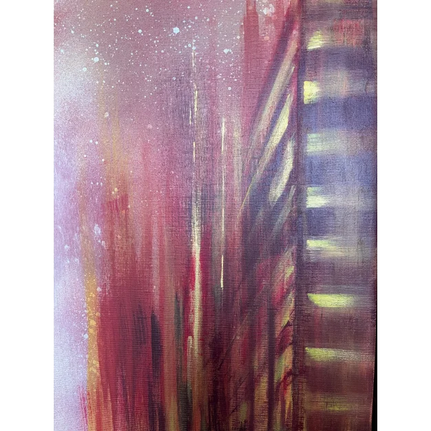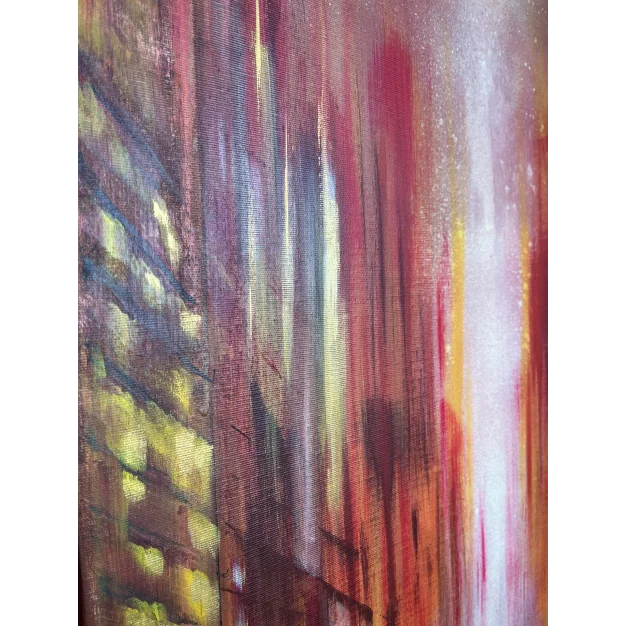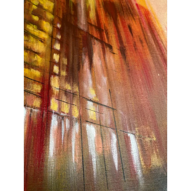 The work represents an urban glimpse during the golden hour, a time when the golden light of sunset bathes everything in warm hues. It is a moment of transition, the boundary between day and night, between activity and stillness. The world seems to have stopped in the midst of the daily life’s movement. The atmosphere is soft and enveloped in a sense of suspended calm, surreal, as if an instant from a dream had been captured. Here and now, it is possible to pause, slow down, and observe reality with new eyes.