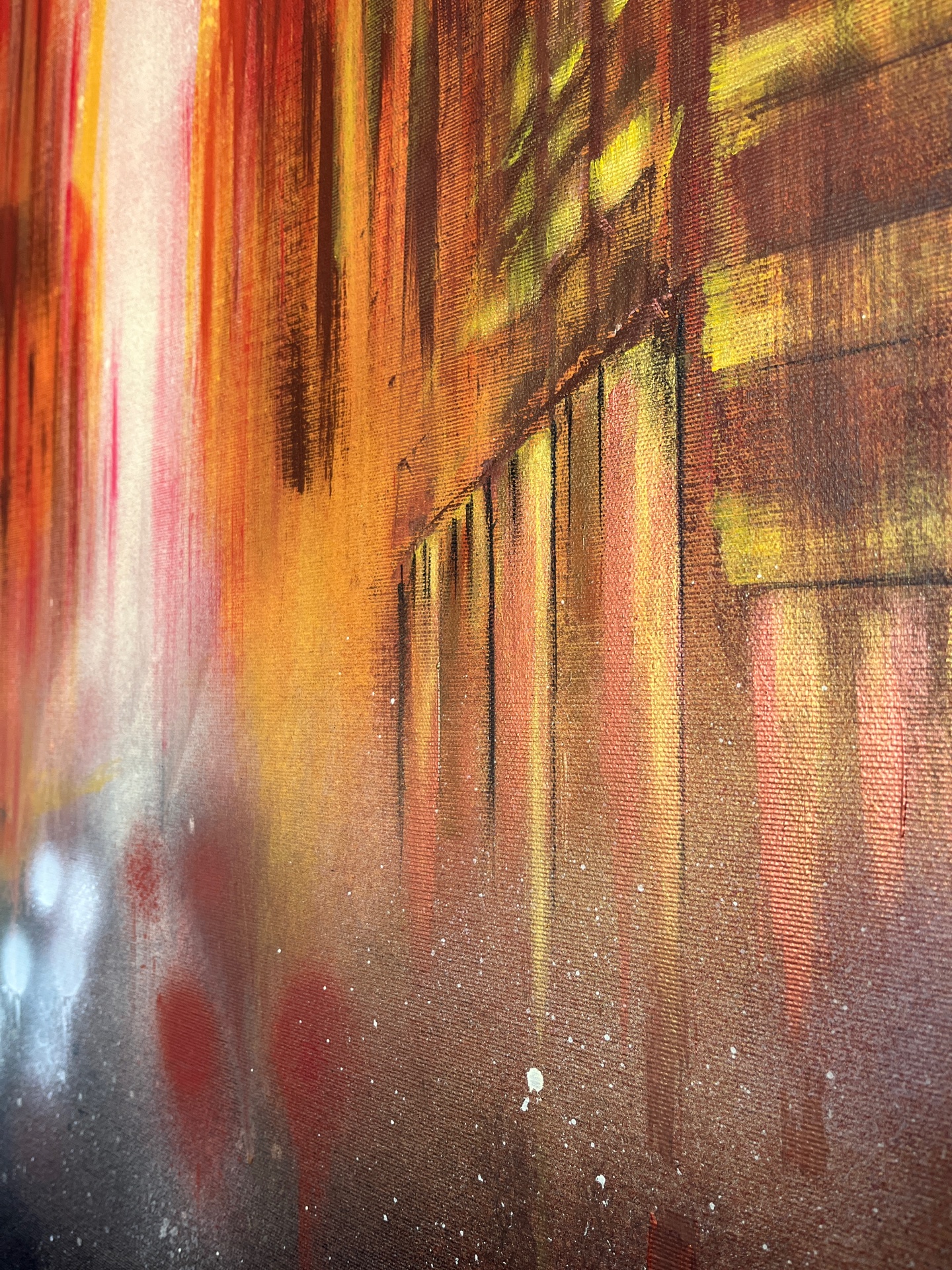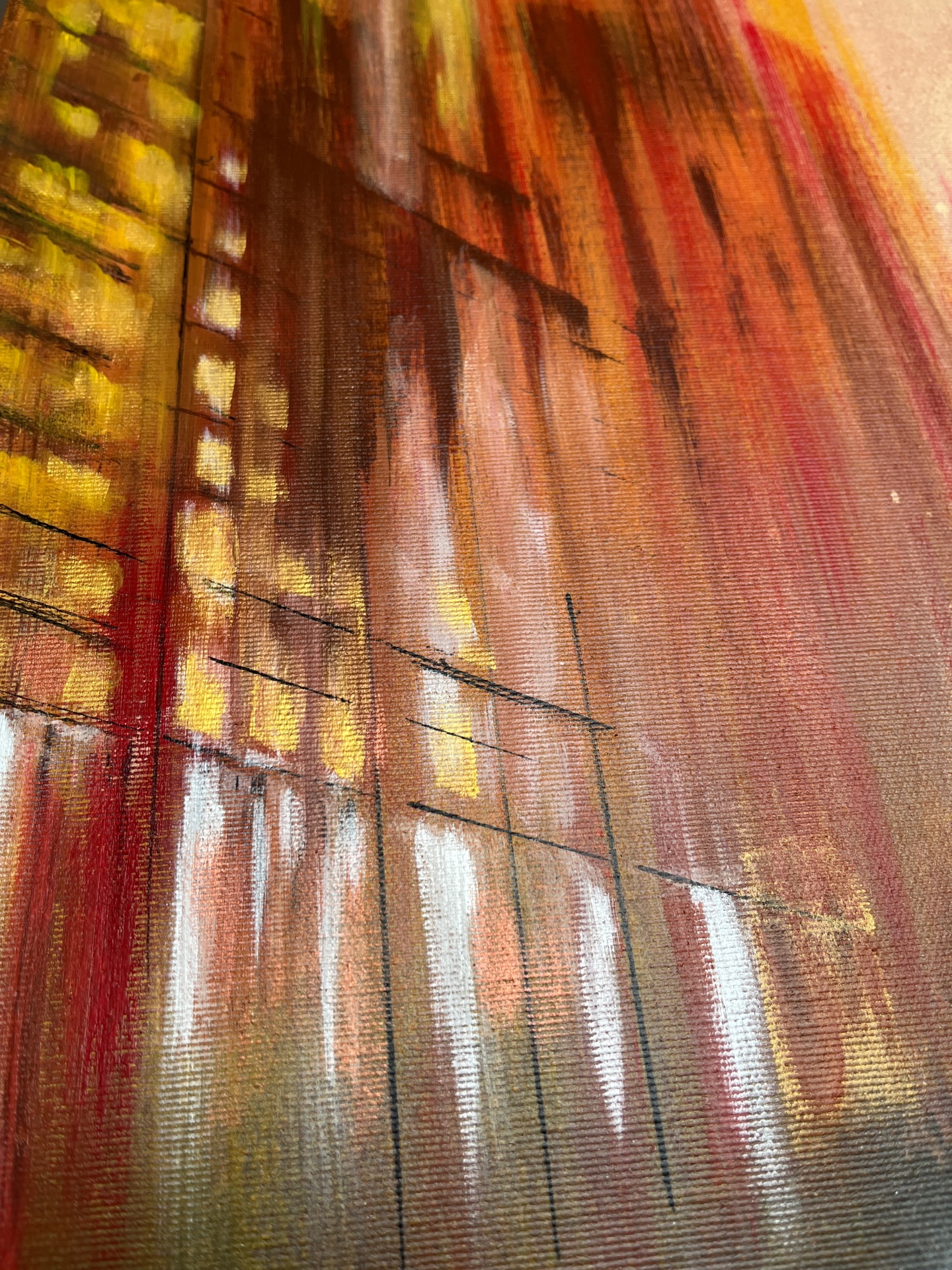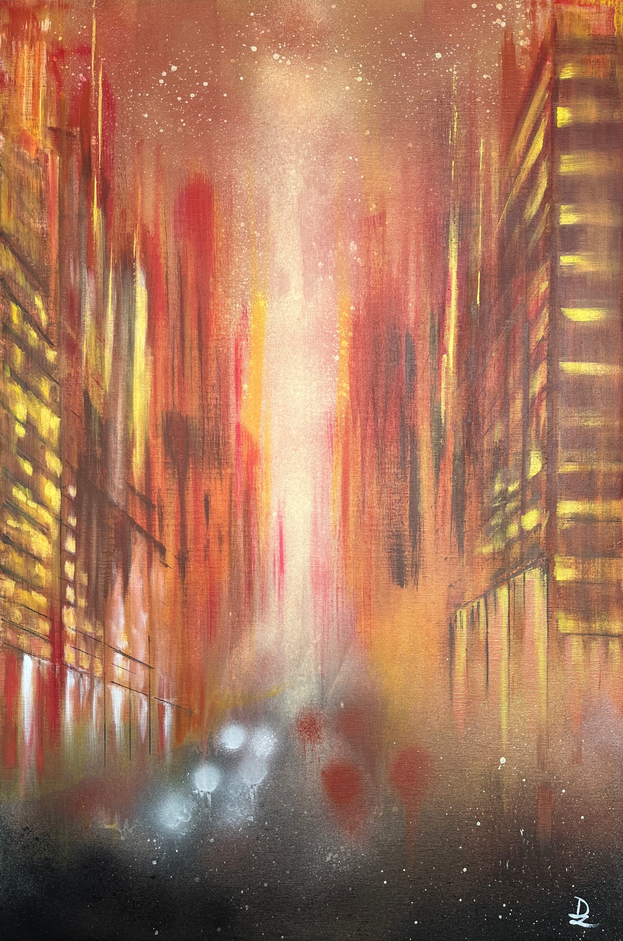 The work represents an urban glimpse during the golden hour, a time when the golden light of sunset bathes everything in warm hues. It is a moment of transition, the boundary between day and night, between activity and stillness. The world seems to have stopped in the midst of the daily life’s movement. The atmosphere is soft and enveloped in a sense of suspended calm, surreal, as if an instant from a dream had been captured. Here and now, it is possible to pause, slow down, and observe reality with new eyes.