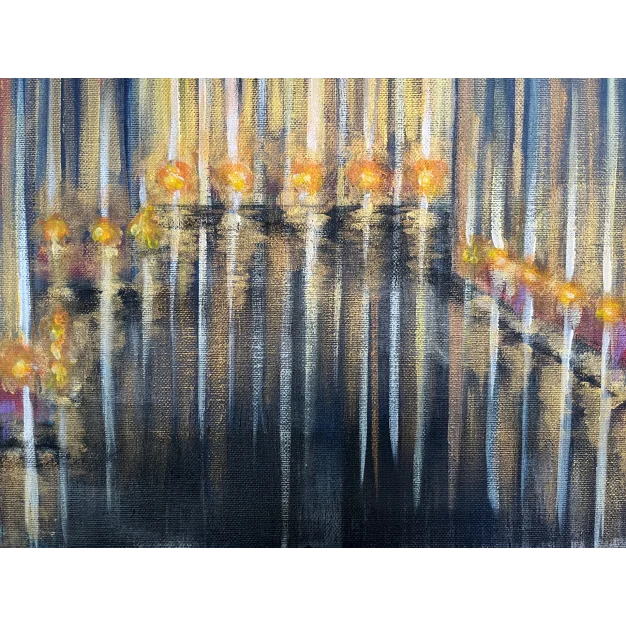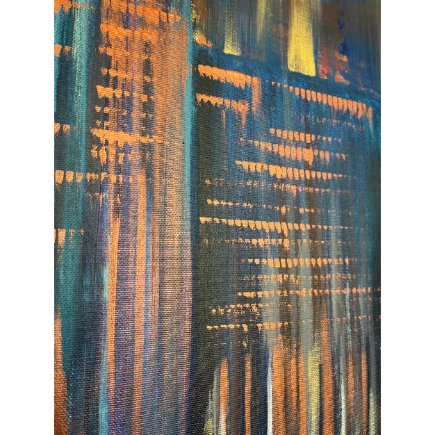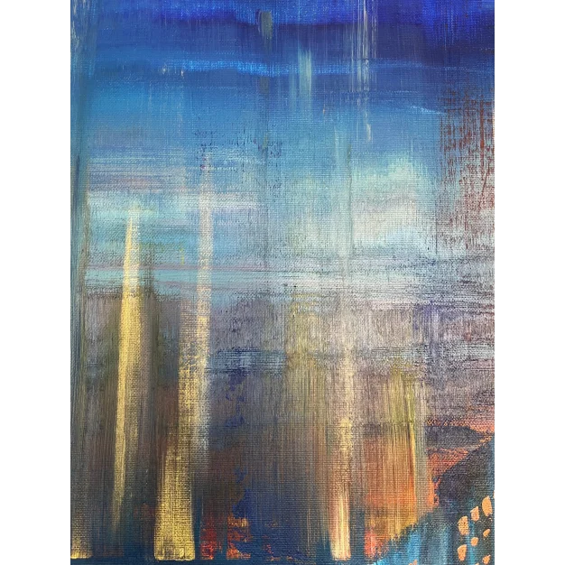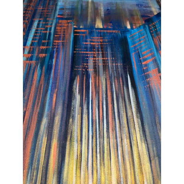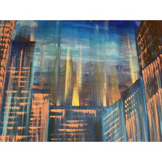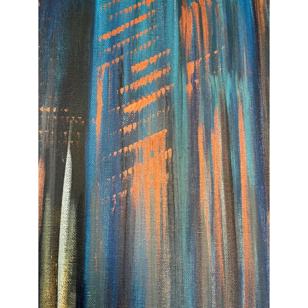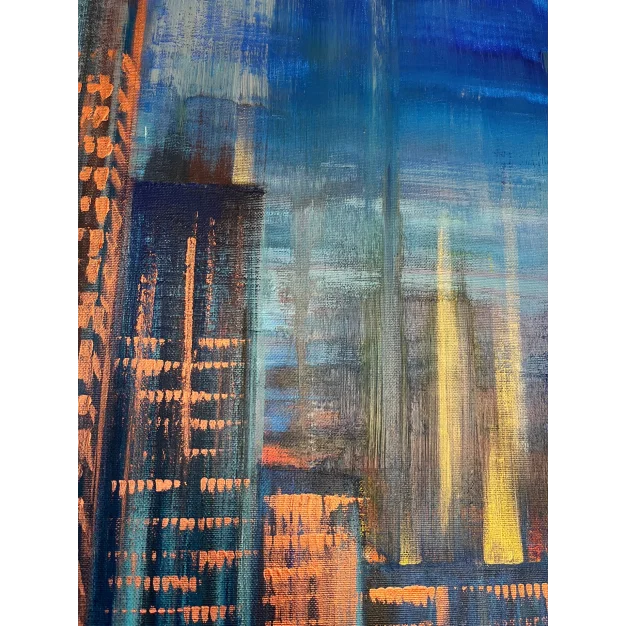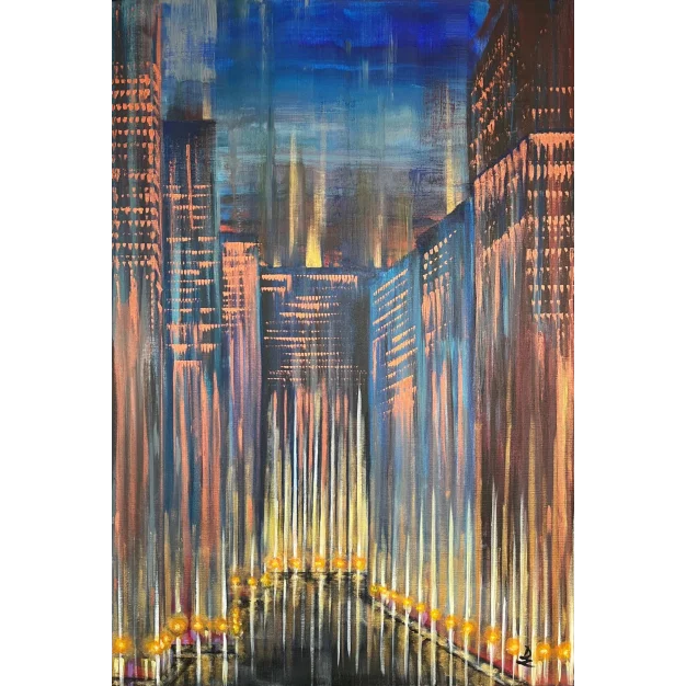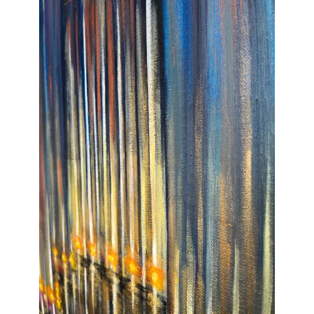In the artwork, the day is drawing to a close, and the last fiery glimmers of sunset dissolve into the transforming colors of the sky. In this dance between light and darkness, in an almost unreal stillness, the city lights turn on, like solitary voices in a profound silence. After the frenzy, the reflections of the streetlamps shine on the deserted streets, enveloping them in their reassuring embrace, while columns of gold rise upwards, reaching beyond earthly boundaries.