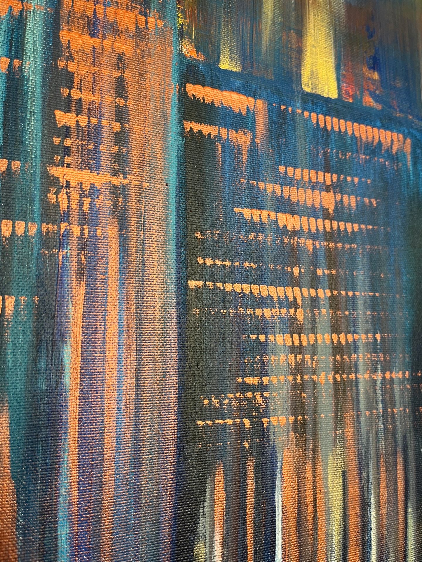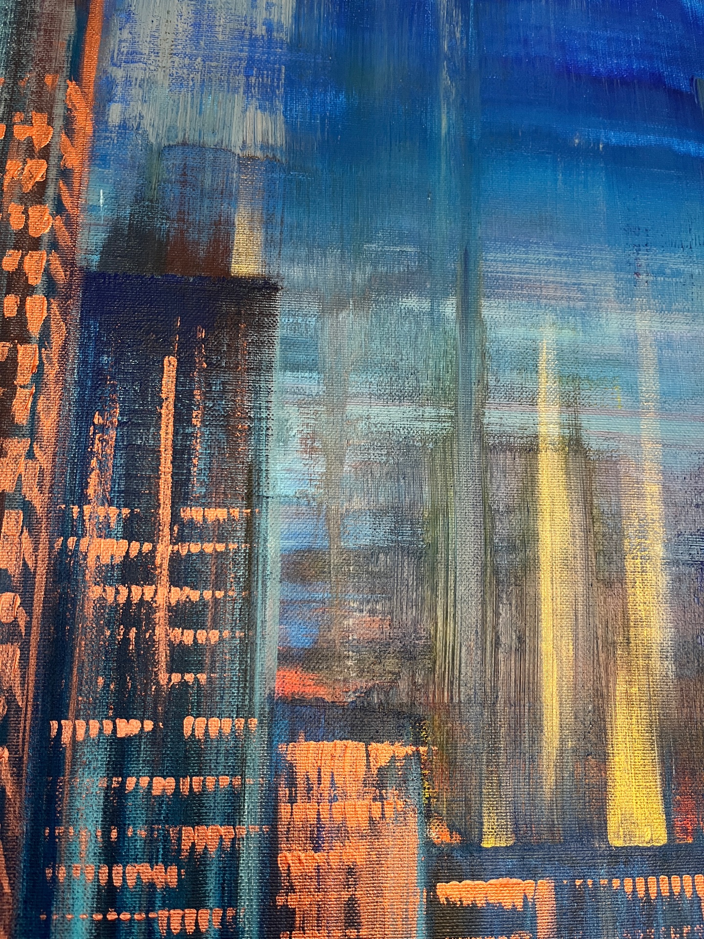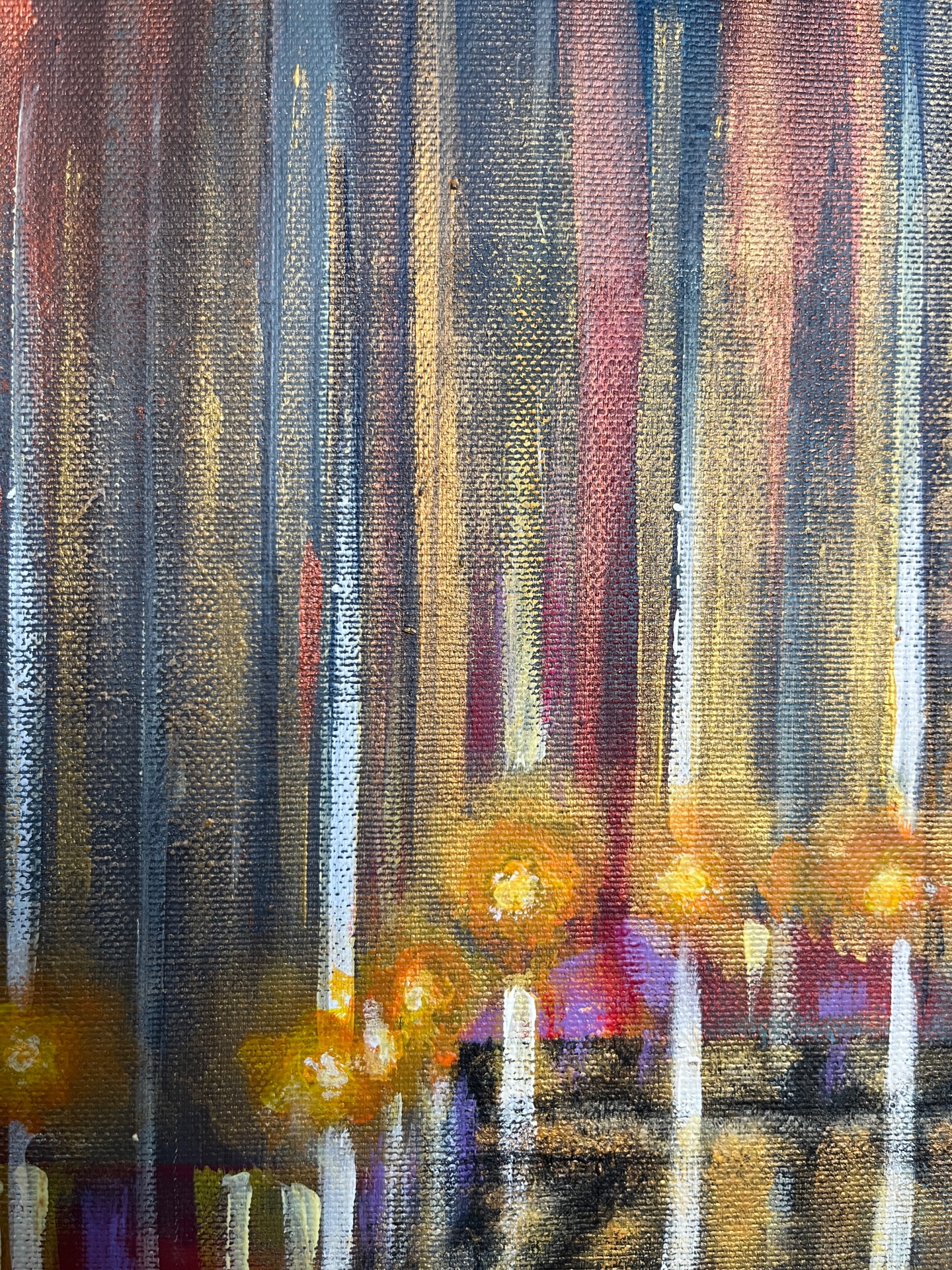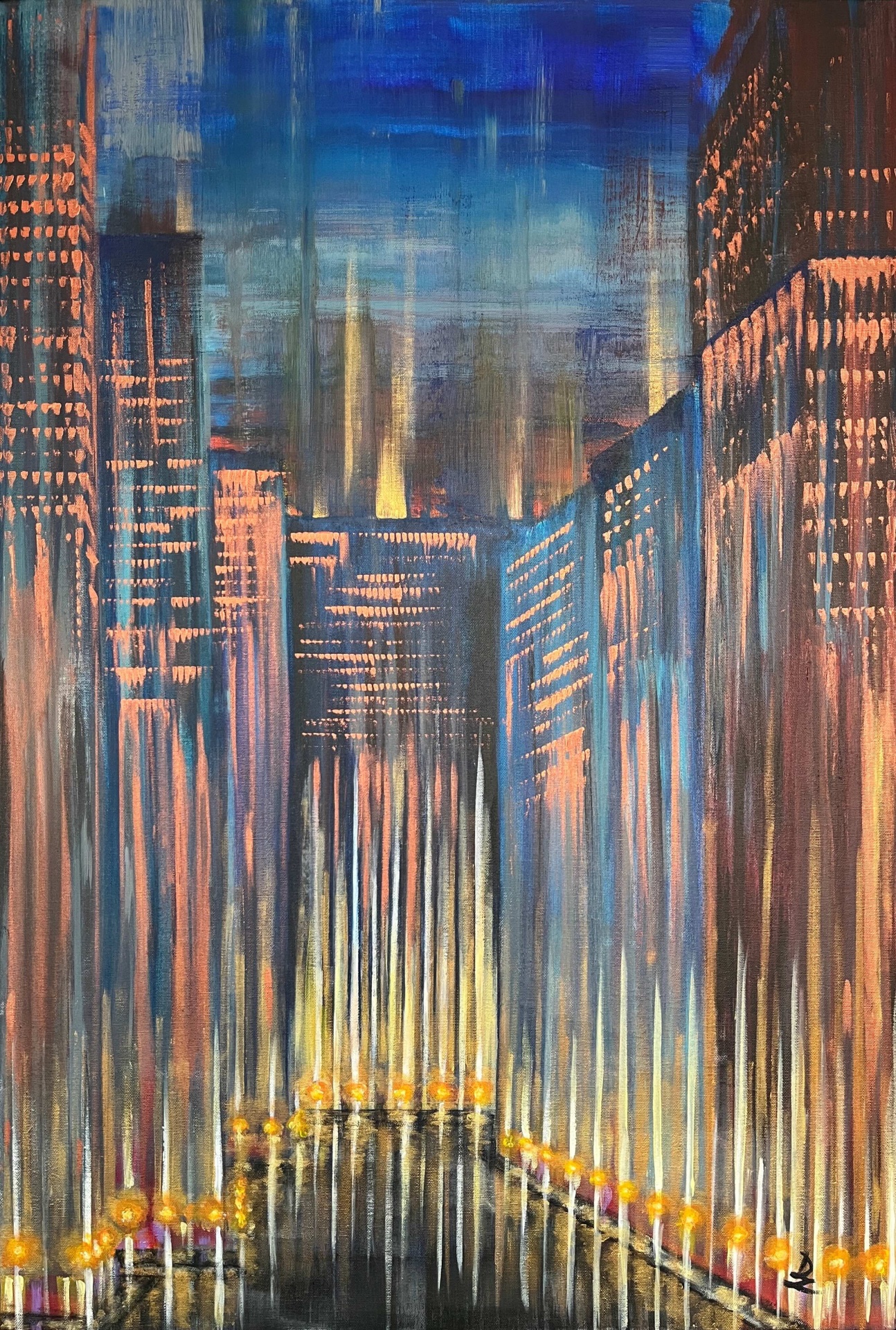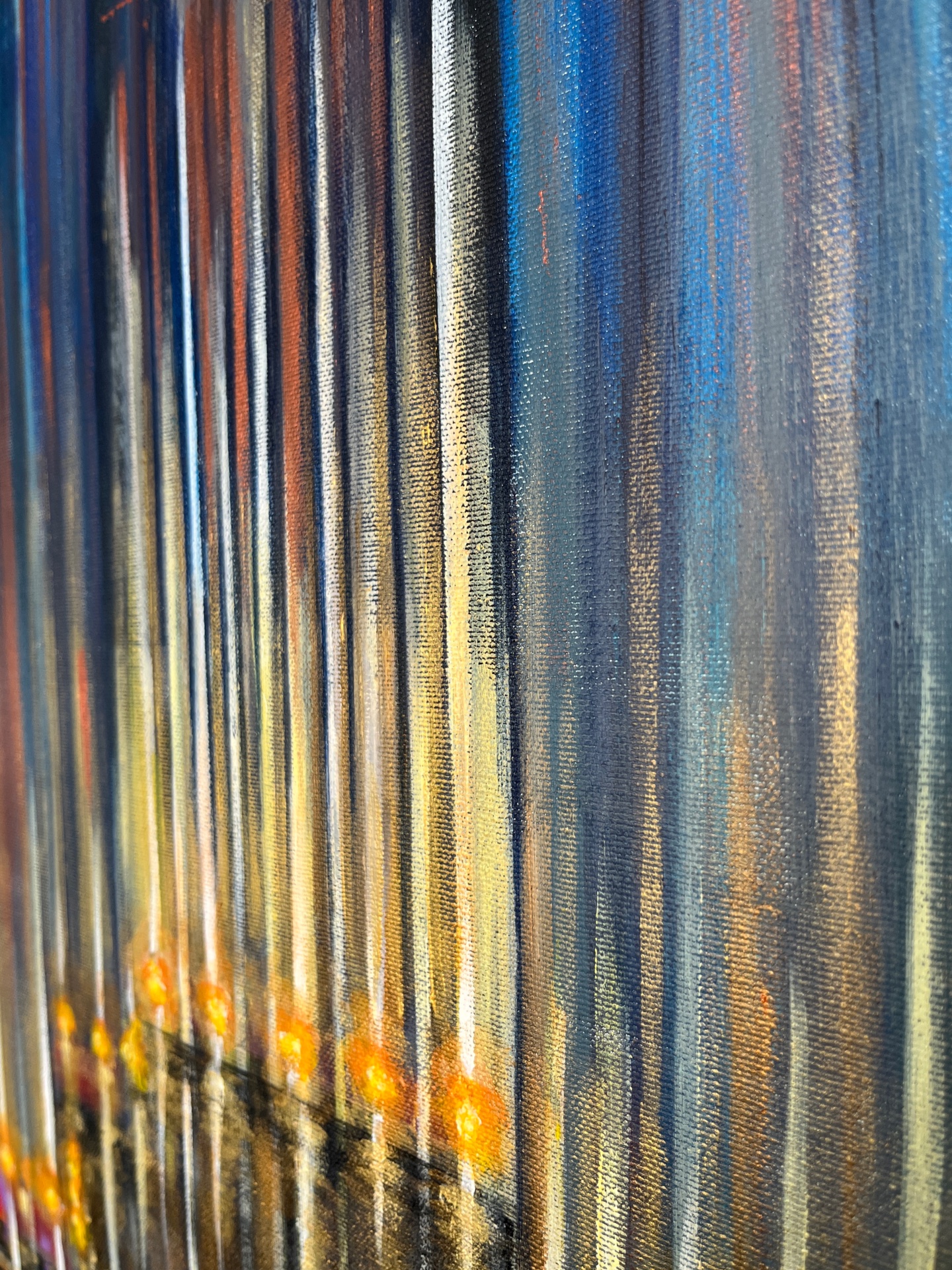 In the artwork, the day is drawing to a close, and the last fiery glimmers of sunset dissolve into the transforming colors of the sky. In this dance between light and darkness, in an almost unreal stillness, the city lights turn on, like solitary voices in a profound silence. After the frenzy, the reflections of the streetlamps shine on the deserted streets, enveloping them in their reassuring embrace, while columns of gold rise upwards, reaching beyond earthly boundaries.