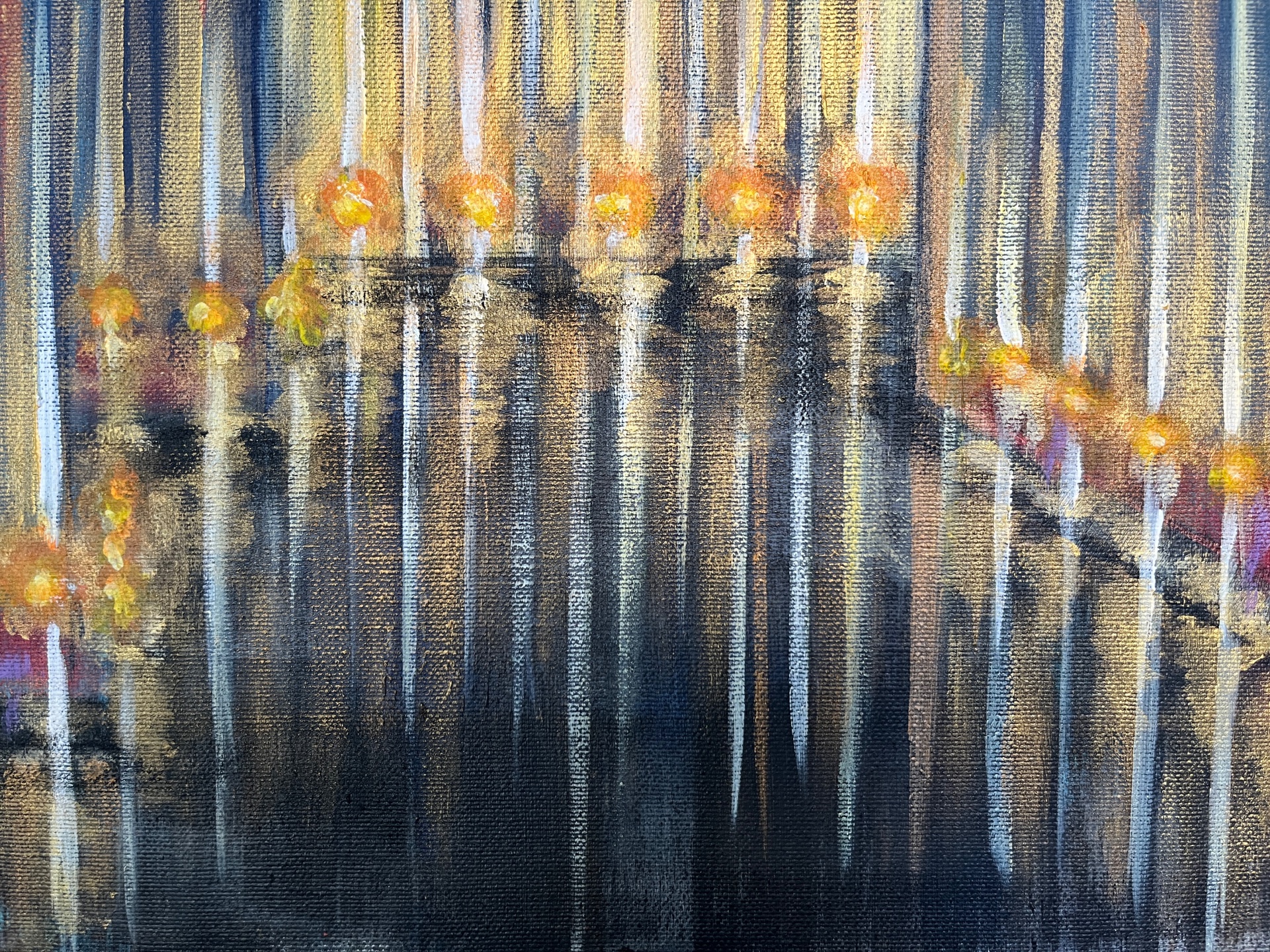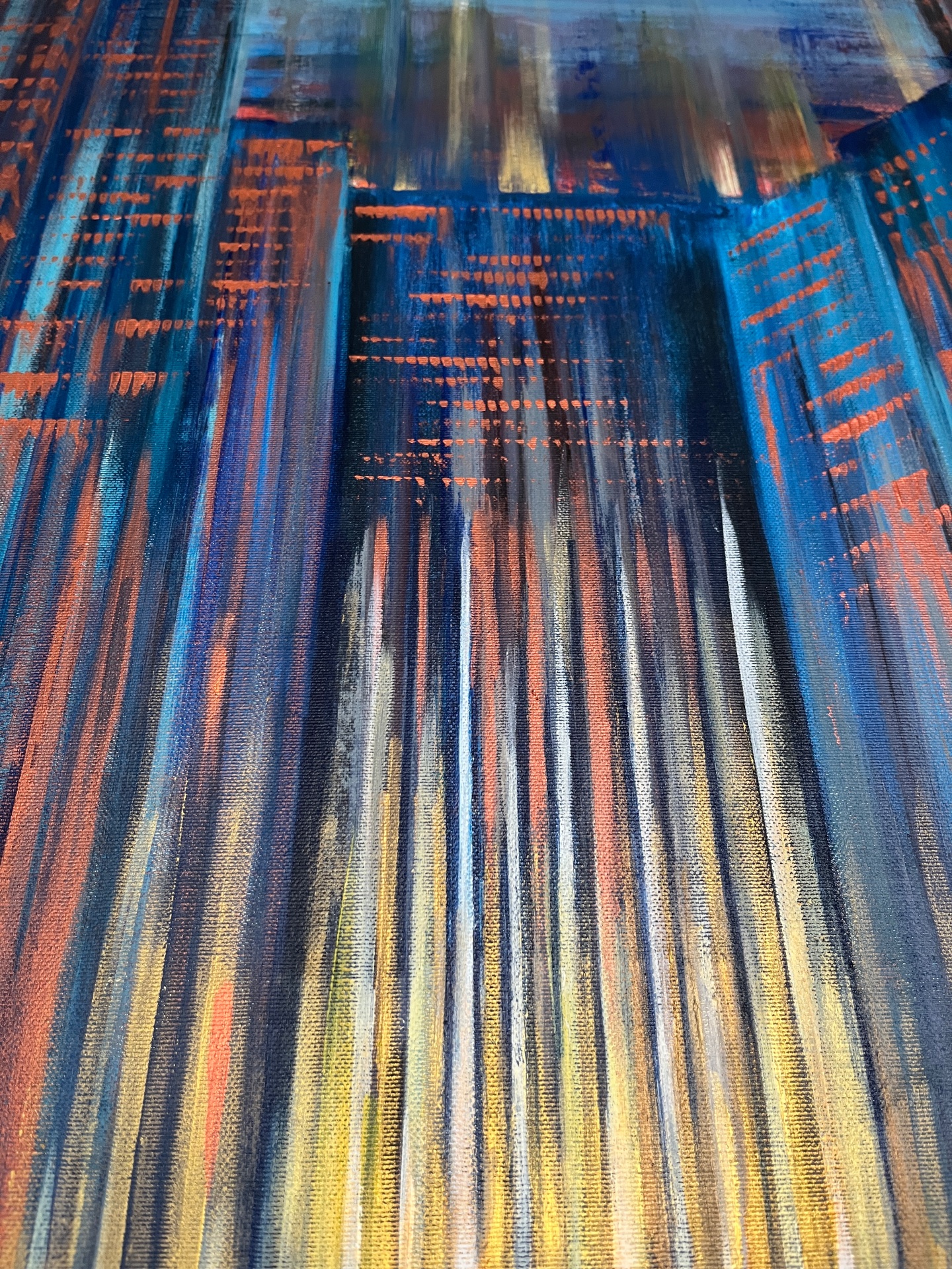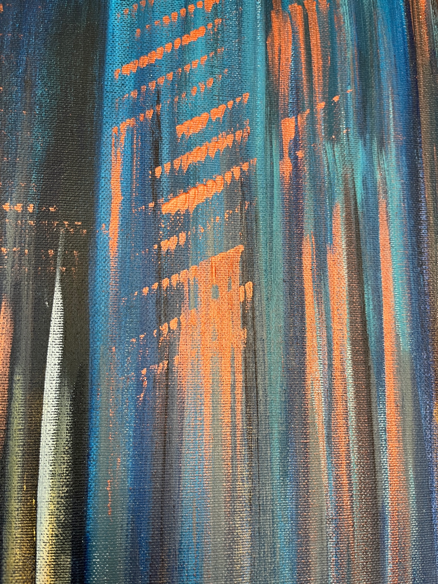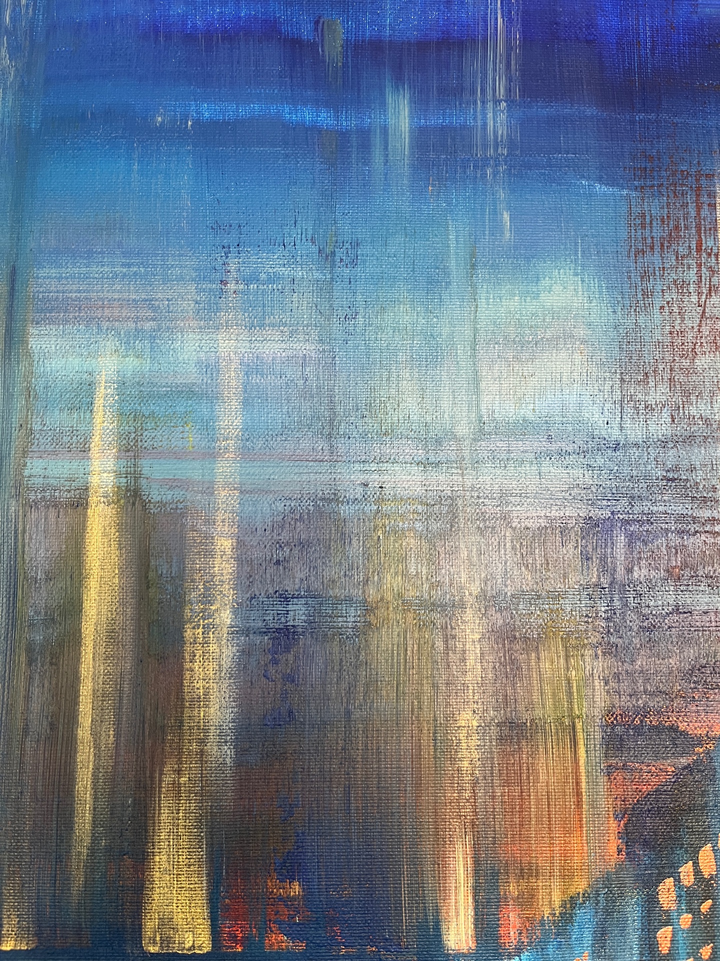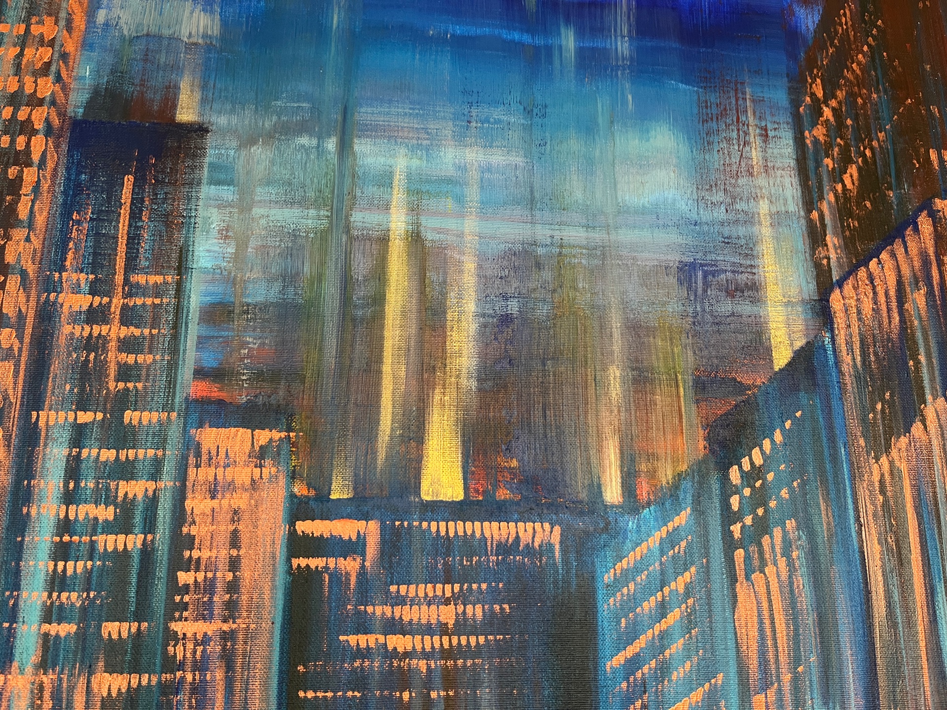 In the artwork, the day is drawing to a close, and the last fiery glimmers of sunset dissolve into the transforming colors of the sky. In this dance between light and darkness, in an almost unreal stillness, the city lights turn on, like solitary voices in a profound silence. After the frenzy, the reflections of the streetlamps shine on the deserted streets, enveloping them in their reassuring embrace, while columns of gold rise upwards, reaching beyond earthly boundaries.